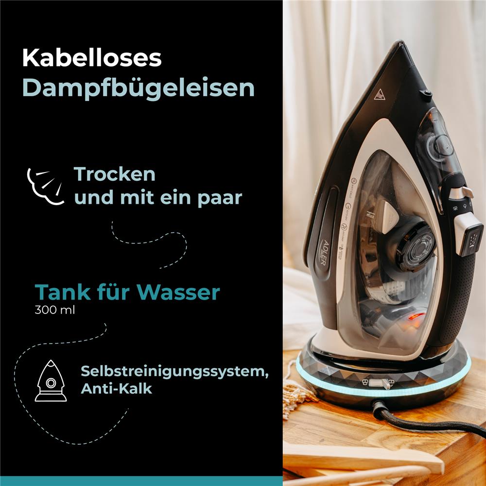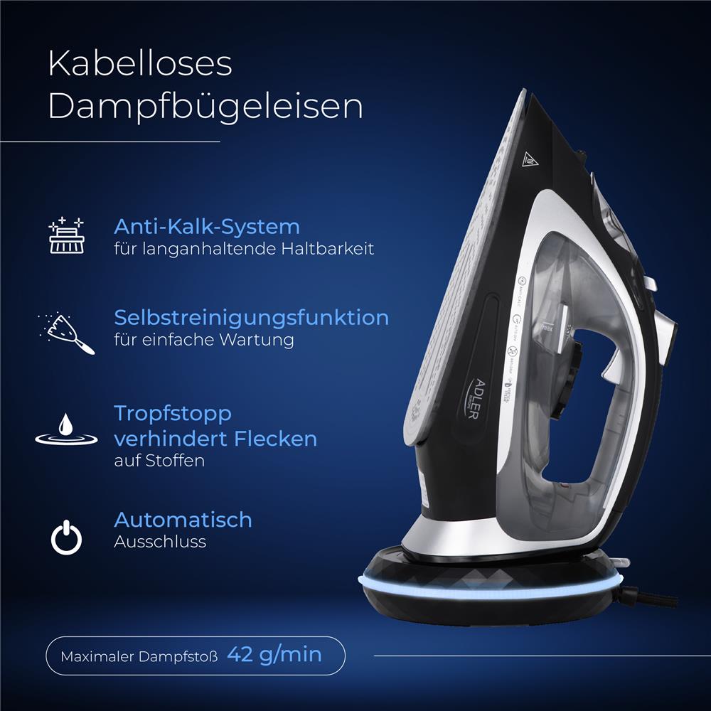 Adler AD 5043 Kabelloses Dampfbügeleisen mit Basisstation Keramiksohle schwarz silber