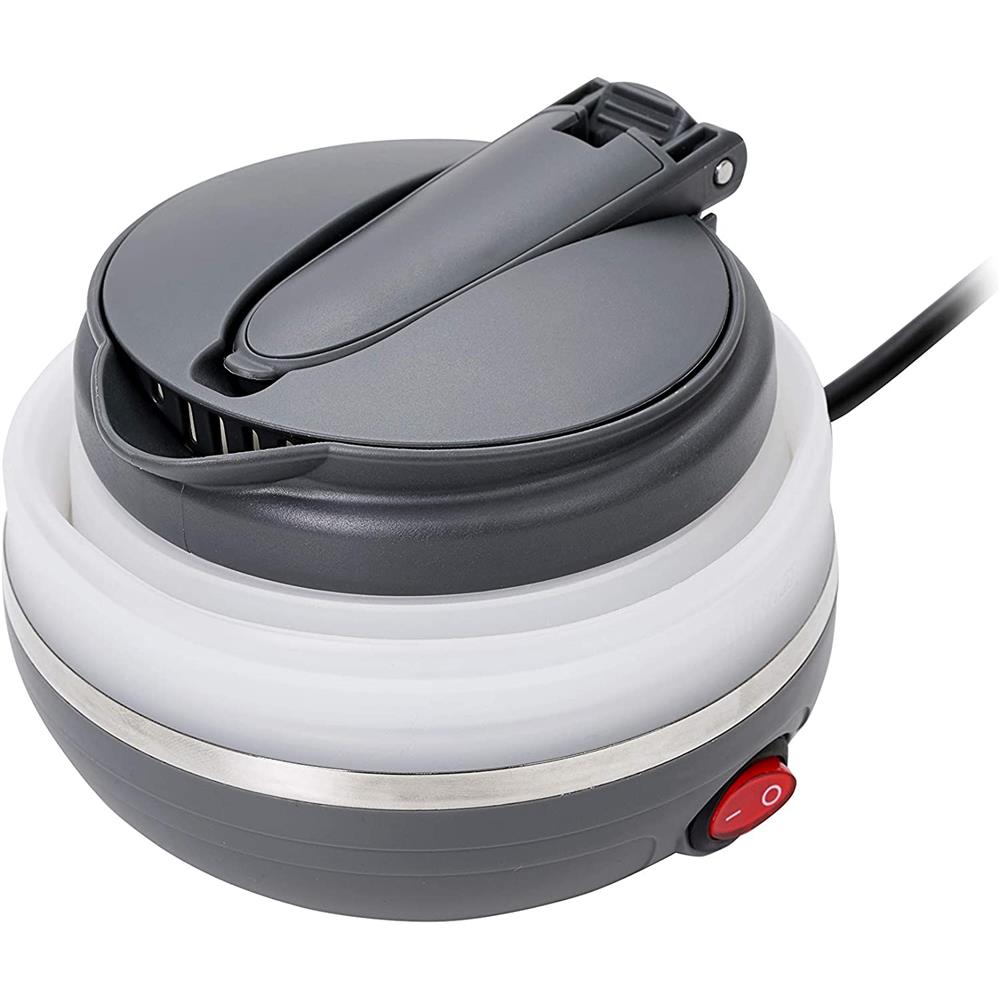 Was man nicht erwartet, wenn man an einen Wasserkocher denkt, ist das faltbare Gehäuse aus Silikon, durch das der Wasserkocher sehr wenig Platz einnimmt. Die kompakte Größe, das robuste Material und das geringe Gewicht sind sehr große Vorteile, die den Wasserkocher in jedes Gepäckstück, sogar in ein Handgepäck oder einen Rucksack, passen lassen. Zusammengeklappt lässt er sich in einem Schrank oder einer Schublade verstauen, was zum Beispiel in einem kleinen Wohnwagen oder Wohnmobil wertvollen Platz auf der Arbeitsplatte schafft. Der weit zu öffnende Deckel ermöglicht das bequeme Ausgießen von Wasser und die Reinigung. Im Inneren des Gehäuses ist ein großer runder Stahlheizkörper installiert. Füllen Sie einfach die richtige Menge Wasser ein, drehen Sie den Knopf auf Position 1 und warten Sie, bis das Wasser kocht, wenn die rote Kontrollleuchte im Schalter aufleuchtet. Funktionalität in ihrer reinsten Form! Ein weiterer Vorteil dieses Wasserkochers ist sein leiser Betrieb und sein geringer Stromverbrauch von nur 750 W.