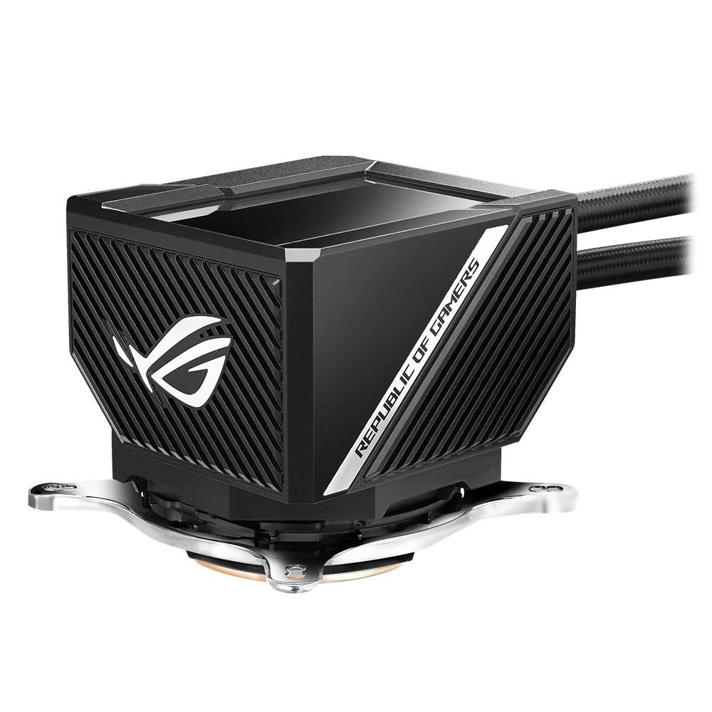 Der ROG Ryujin II überwindet eine der Einschränkungen traditioneller Flüssigkeitskühler, indem er mit einem in das Pumpengehäuse integrierten 60-mm-Lüfter für einen ausreichenden Luftstrom zum Bereich um den CPU-Sockel sorgt. Dieser Lüfter transportiert Luft zu den CPU-VRMs, dem M.2-Steckplatz und den umliegenden Komponenten, um die Temperaturen zu senken und so die Leistung und Stabilität zu verbessern.