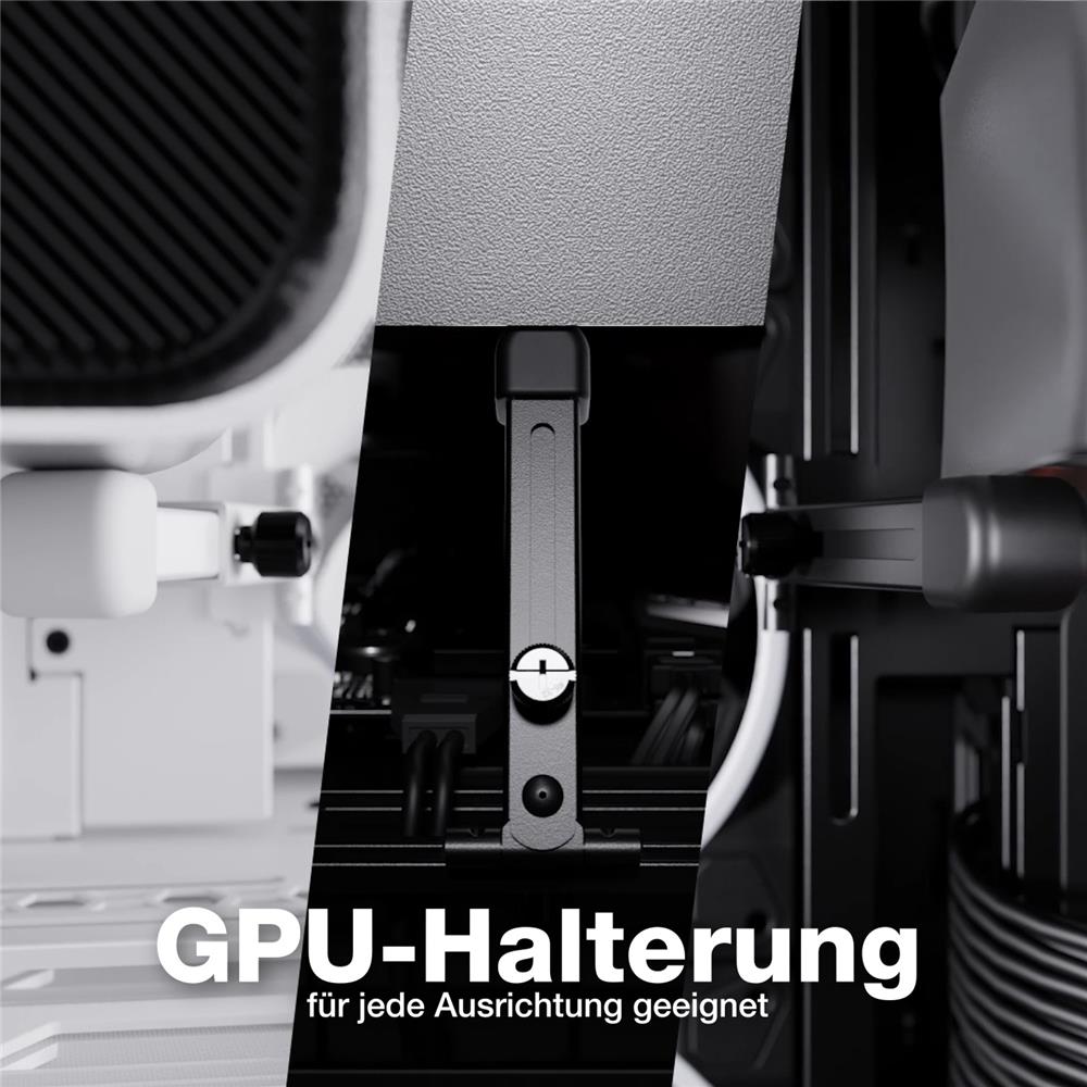 Light Base 900 DX Black kommt mit einem flexiblen Grafikkartenhalter der subtil deine Grafikkarte am Absinken hindert. Das Beste daran: Der Grafikkartenhalter funktioniert in alle Richtungen, sowohl mit horizontal als auch vertikal installierten GPUs. Somit sieht dein System selbst mit schwerster Hardware aufgeräumt aus.