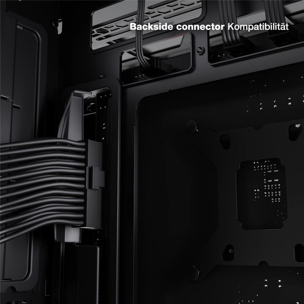 Das Mainboard-Tray unterstützt Backside Connector Designs wie Asus BTF (Back to Future), MSI Project Zero und Gigabyte Project Stealth für einen optisch ansprechenden, kabelfreien Auftritt.