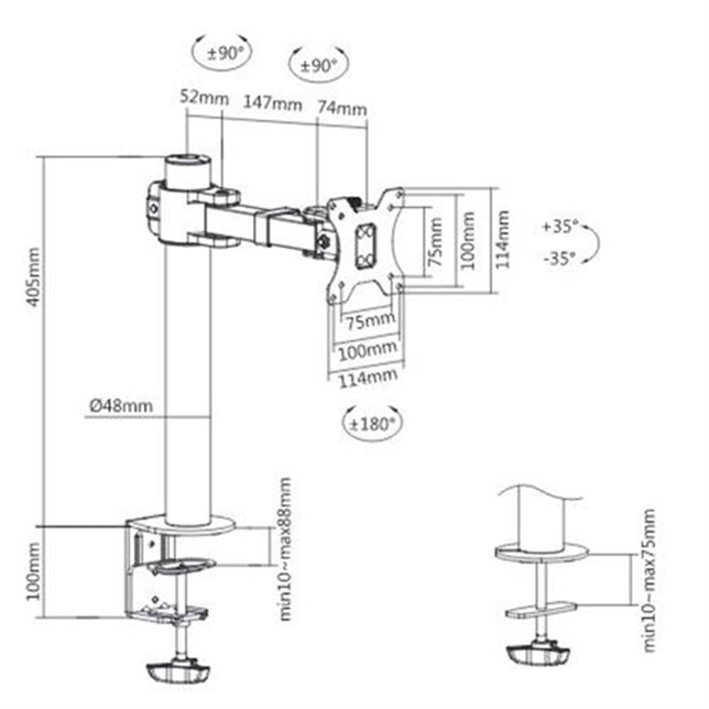 • Volle Bewegung, einfach einzustellen und ohne Werkzeug / Der Arm ist auf maximal 199 mm ausfahrbar