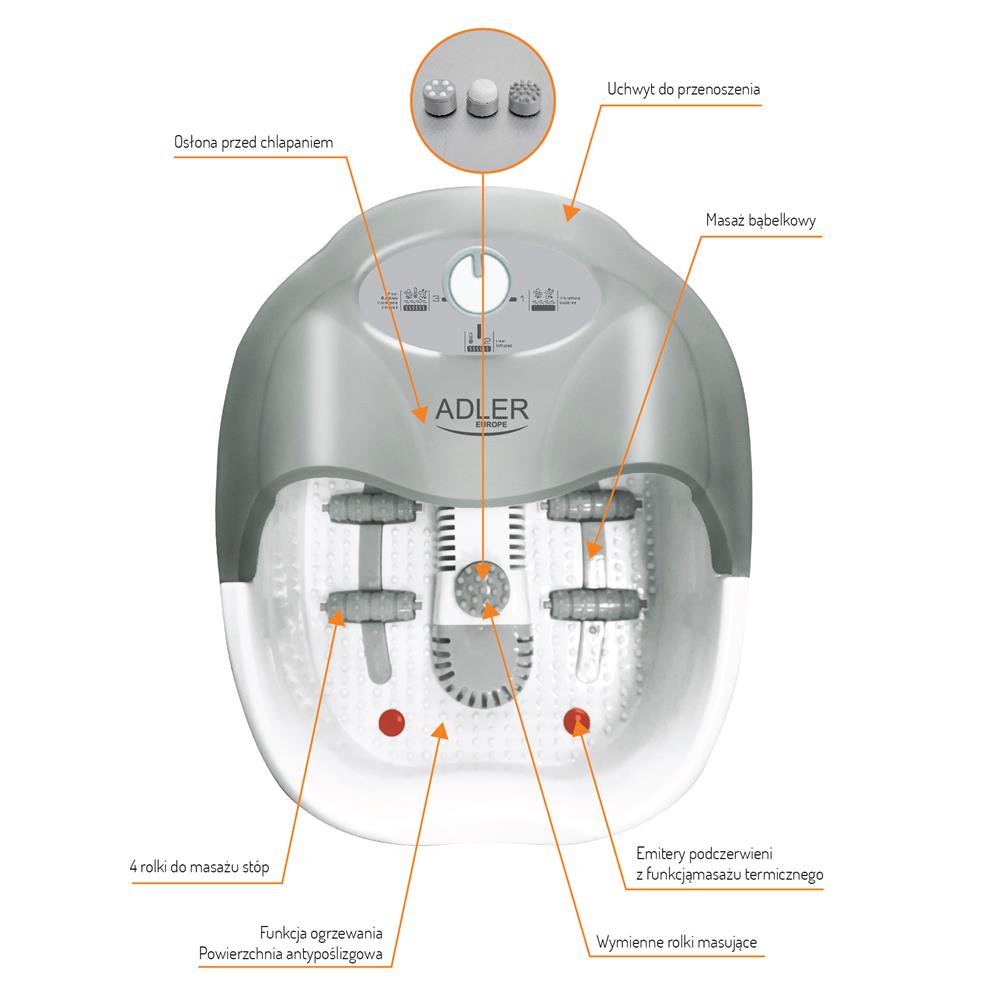 Ein Fußmassagegerät mit Tragegriff kann sowohl zu Hause als auch im professionellen Spa verwendet werden. Dank 4 Rollen für die Reflexzonenmassage und 3 austauschbaren Massageaufsätzen sowie Luftdüsen für die Sprudelmassage (Vibrations- und Sprudelmassage in kaltem Wasser, Vibrations- und Sprudelmassage in warmem Wasser oder Infrarotmassage) kann es auch für Gesundheitsbehandlungen verwendet werden. Das Gerät ist außerdem mit einer Fußstütze ausgestattet die noch mehr Entspannung ermöglicht. Hinzu kommen sichere Anti-Rutsch-Füße für optimalen Halt auch auf rutschigen Boden.