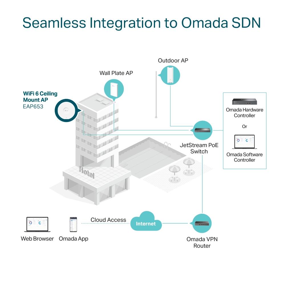 • Zentralisiertes Cloud-Management: Die Omada SDN-Integration verwaltet das gesamte Netzwerk lokal oder aus der Cloud.