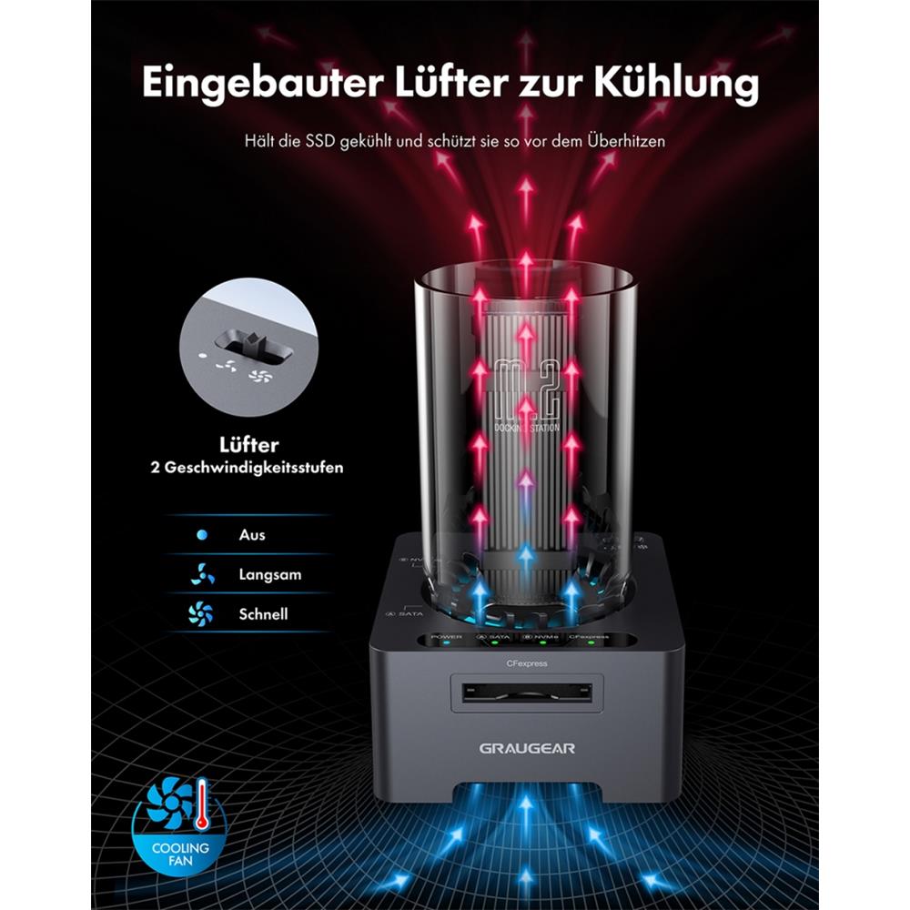 Die GRAUGEAR Docking Station G-M2DK-CR-10G ist die ideale Lösung, wenn Daten zwischen M.2 NVMe und / oder NGFF SSDs kopiert werden sollen, oder auch von SSD zu / von einer CFexpress-Karte. Und für ausreichende Kühlung sorgt ein aktiver, leiser 60mm Lüfter und der abnehmbare Zylinder sorgt für eine optimale Wärmeabfuhr.