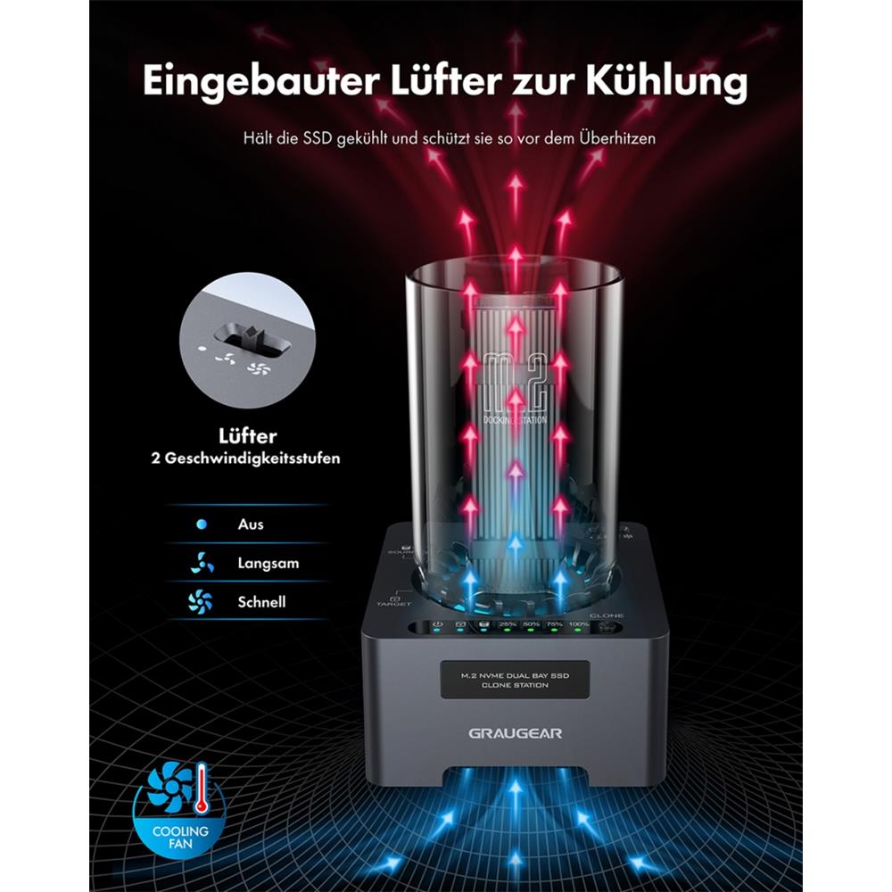 Die GRAUGEAR Klonstation G-M2DK-CL-20G ist die ideale Lösung, wenn M.2 NVMe SSDs, auch bootfähige SSDs, 1:1 geklont werden sollen. Geklont werden kann auch ganz ohne PC / Notebook über die One-Touch Klontaste. Die Premium Aluminiumkühlkörper zusammen mit dem leisen 60mm Lüfter sorgen für eine hervorragende Kühlleistung der NVMe SSDs.