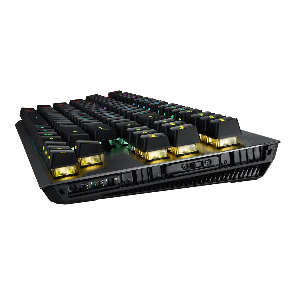 Die optisch-mechanischen ROG-RX-Red- und RX-Blue-Switches bieten konsistente, schwingungsfreie Tastenanschläge mit einer extrem kurzen Reaktionszeit von 1 ms und einer Lebensdauer von 100 Millionen Anschlägen. Diese Premium-Switches besitzen ein Hollow-Square-Schaftdesign und verfügen über eingebettete RGB-LEDs, die eine vollständige Beleuchtung jeder einzelnen Taste ermöglichen.
