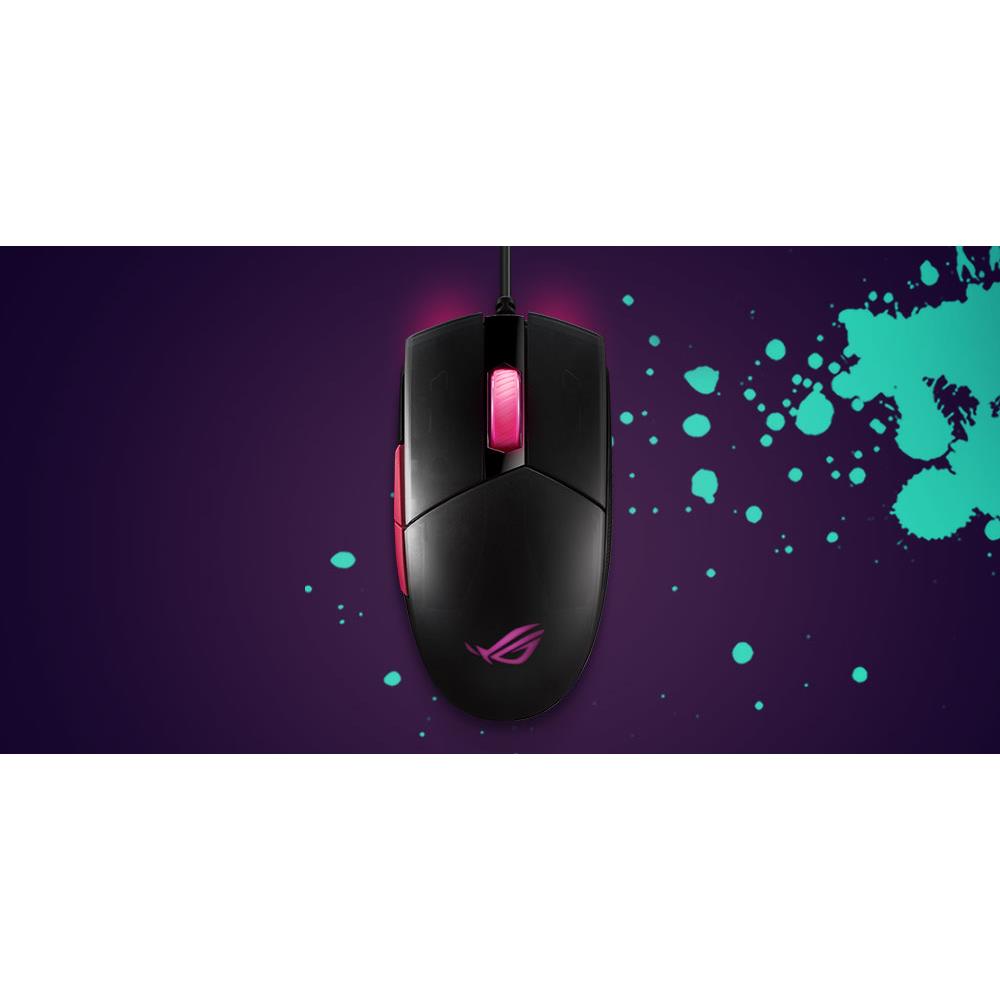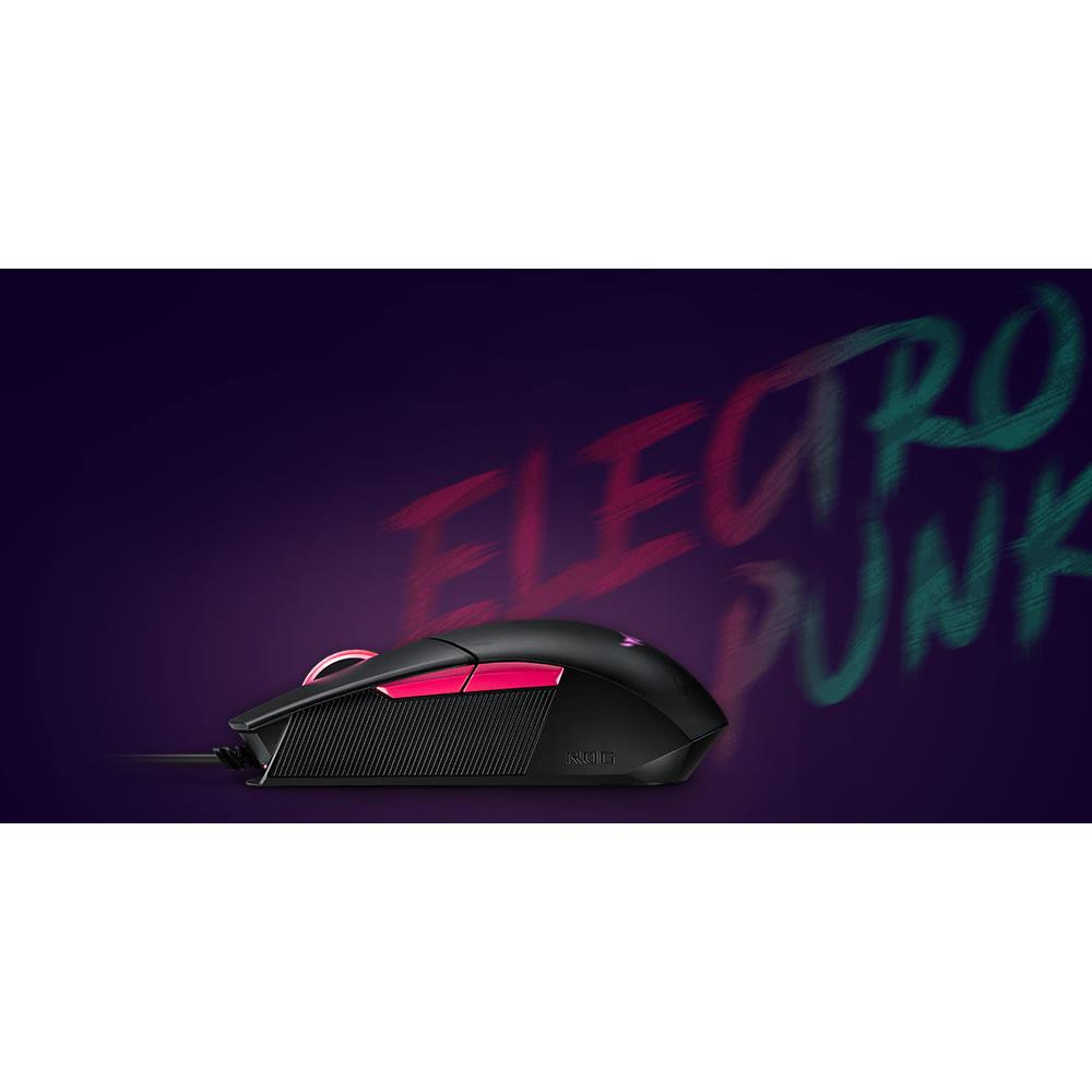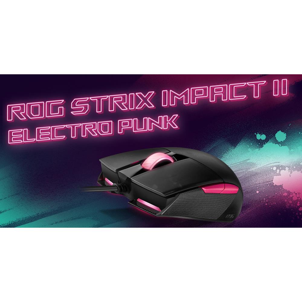 Die ROG Strix Impact II Electro Punk ist eine beidhändige, ergonomische Gaming-Maus mit optischem 6.200-DPI-Sensor, leichtem Design und Aura-Sync-RGB-Beleuchtung