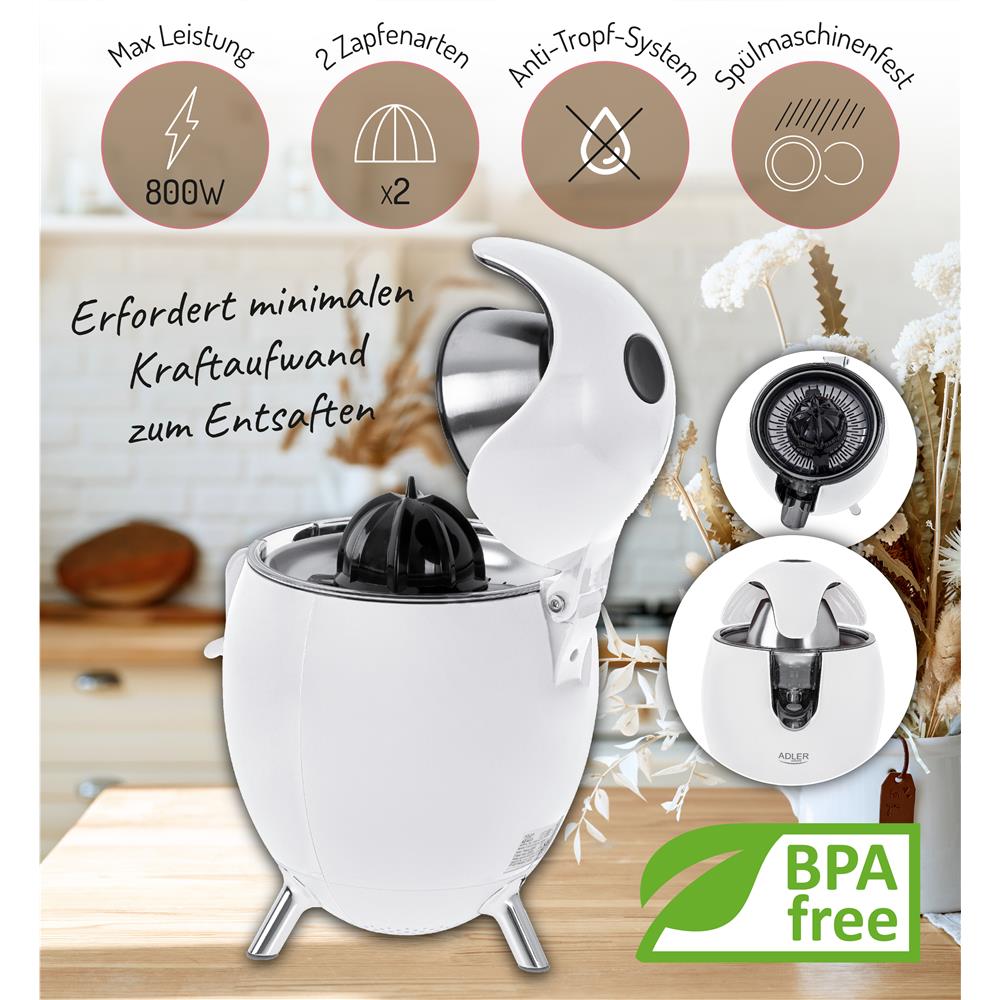 Adler AD 4013 Zitruspresse in Weiß 800W mit Sieb aus Edelstahl und Anti Tropf System