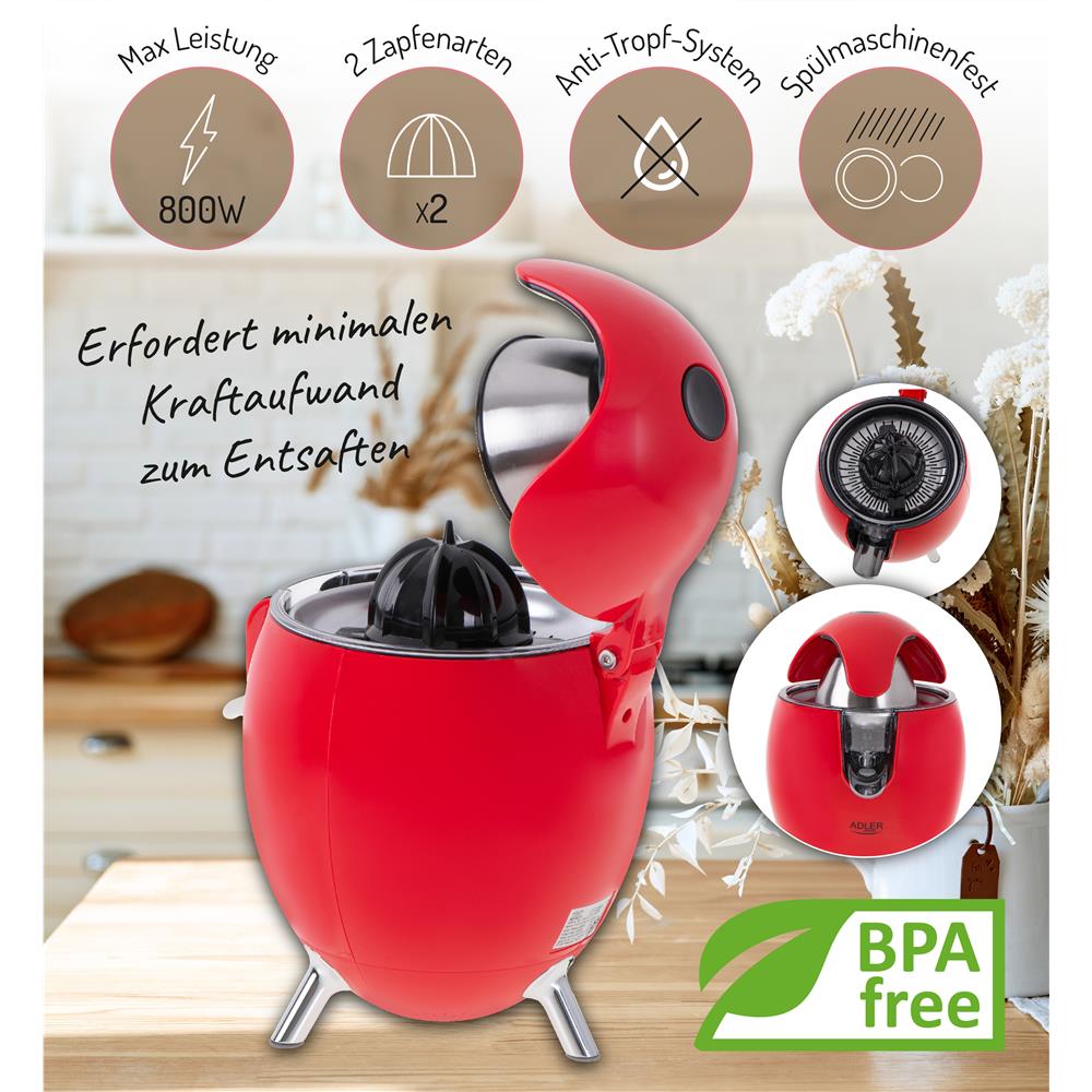 Adler AD 4013 Zitruspresse rot Saftpresse elektrisch Fruchtfleisch Sieb Edelstahl Anti Tropf System