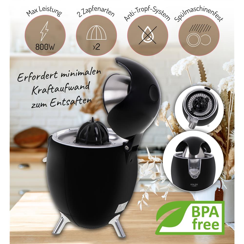 Adler AD 4013 Zitruspresse schwarz Saftpresse elektrisch Fruchtfleisch Sieb Edelstahl Anti Tropf System