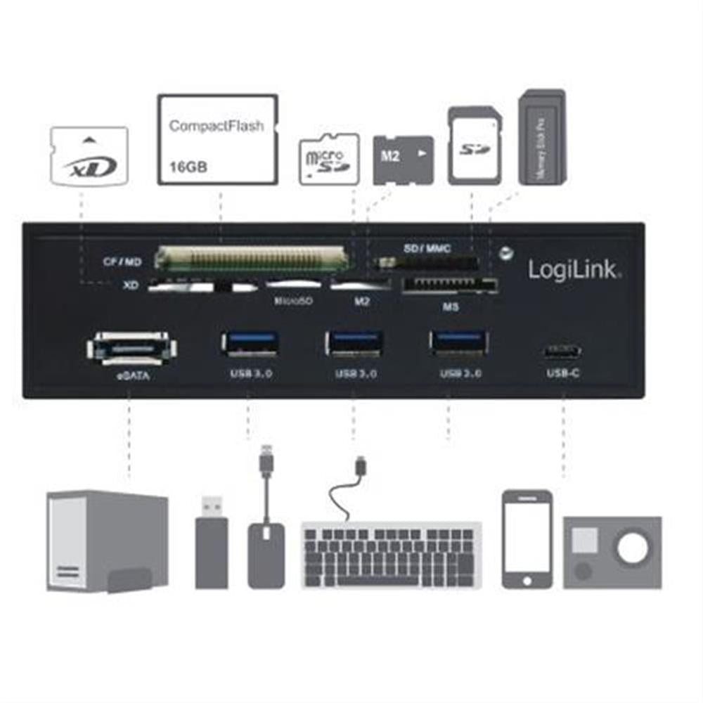Mit dem Multifunktion-Panel von LogiLink können Sie Ihre Anschlussmöglichkeiten Ihres Computers schnell und einfach erweitern: 6 verschiedene Kartentypen können Sie nun in die entsprechenden Kartenschlitze stecken, wie etwa M2, MS, SD, microSD, XD oder CF Karten, und die Daten übertragen. Ebenso gibt es drei USB 3.0 Typ-A, einen USB Typ-C , sowie einen eSATA Port, an denen Sie nach Belieben Geräte anschließen können. Das Multifunktion-Panel kann einfach in die 5,25" große Frontplatte eines Computergehäuses montiert werden und bringt Ihnen so zusätzliche Anschlussmöglichkeiten.