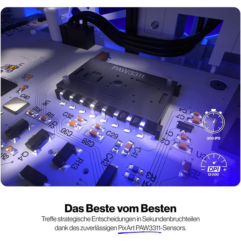 - Hochwertiger PixArt PAW3311 Sensor mit bis zu 12.000 DPI und 300 IPS