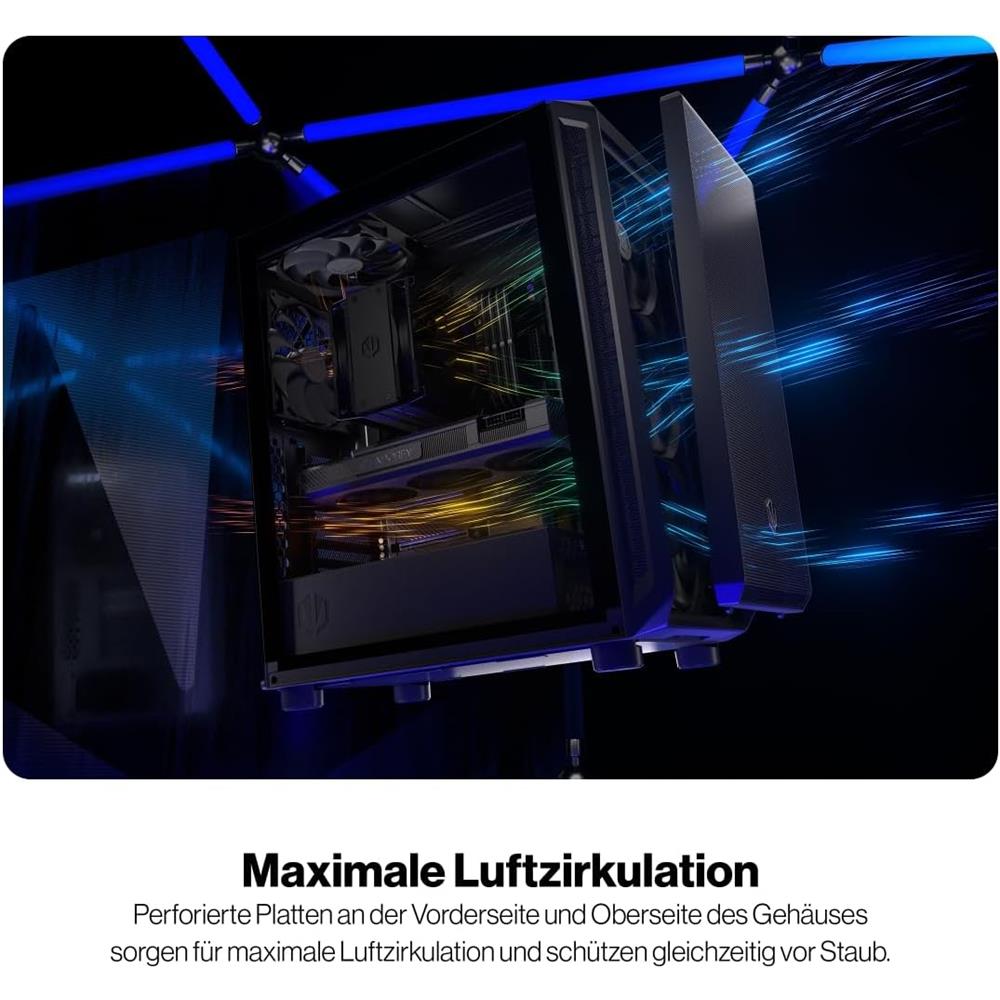 Unser PC-Gehäuse fasst bis zu 7 Lüfter (ja, Kühlung ist uns sehr wichtig). Außerdem dienen die fein perforierten Front- und Oberflächen als Filter, sodass Sie keine zusätzlichen Staubschutzabdeckungen hinzufügen müssen – das ist großartig, denn jede unnötige Schicht auf einem Gehäuse verringert den Luftstrom. Und wir wissen alle, dass Komponenten eine Brise lieben.