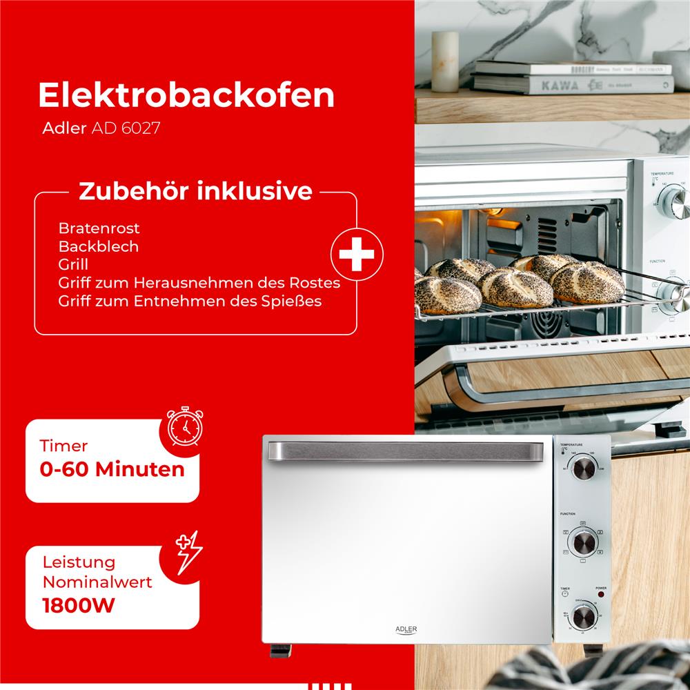 Adler AD 6027 Elektrobackofen 48L Mini Backofen Umluft Timer Drehspieß weiß
