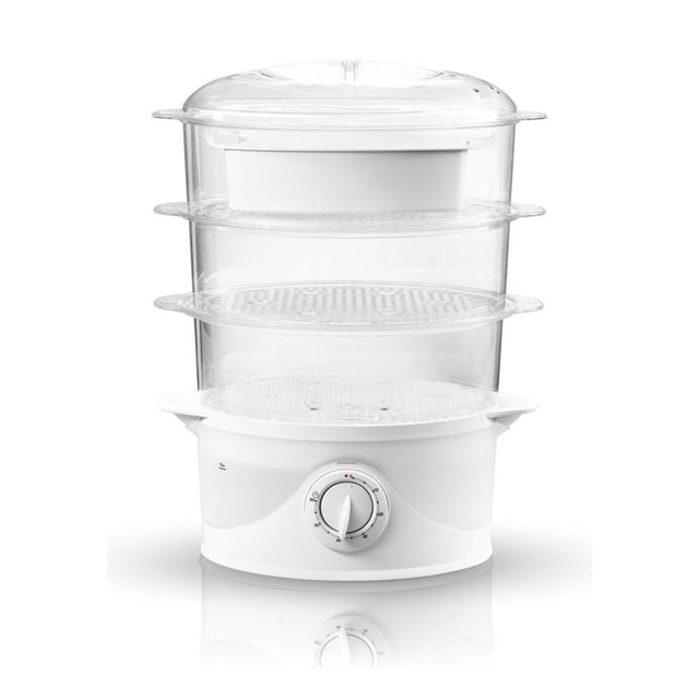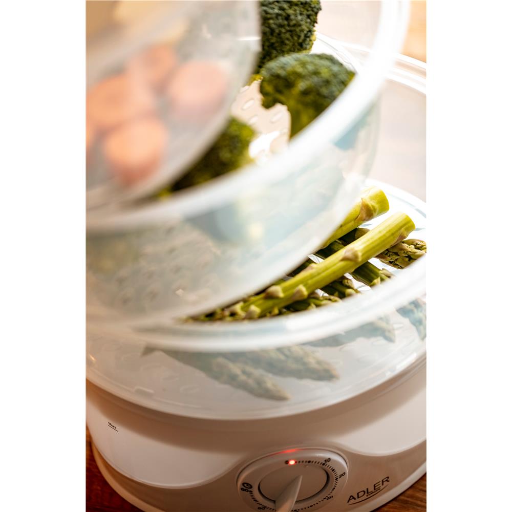 Dank der Schichtbehälter ist es möglich, mehrere Gerichte gleichzeitig zuzubereiten. Der erzeugte Dampf zirkuliert im Inneren des Geräts und sorgt für eine gleichmäßige Erwärmung aller Produkte. Das perfekte Gerät für Menschen, die leichte Mahlzeiten ohne Fett schätzen. Der Dampfgarer kann für Gemüse, Fleisch und Fisch verwendet werden. Es hat auch einen eingebauten Eierständer zum Kochen von Eiern. Darüber hinaus verfügt der Dampfgarer über eine schnelle Startzeit für die Dampfproduktion, was die Zubereitung von Mahlzeiten beschleunigt. Dank der eingebauten Zeitschaltuhr ist es einfach, den richtigen Grad der Zubereitung von Mahlzeiten zu erreichen.