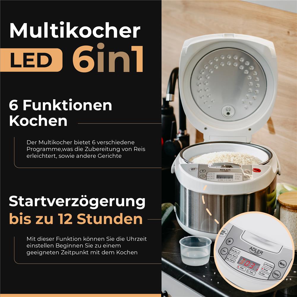 Adler AD 6420 Multikocher 6 Programme 700W Reiskocher Dampfgarer Schongarer weiß silber