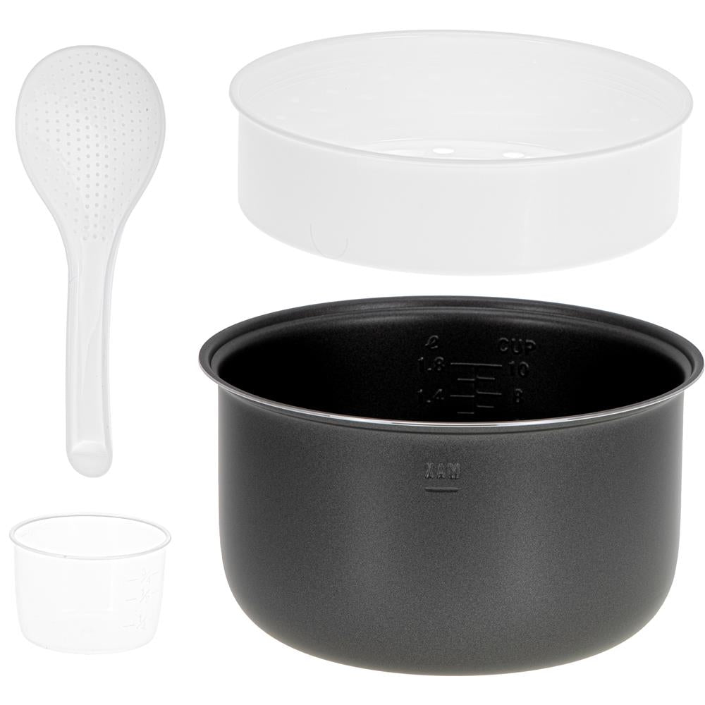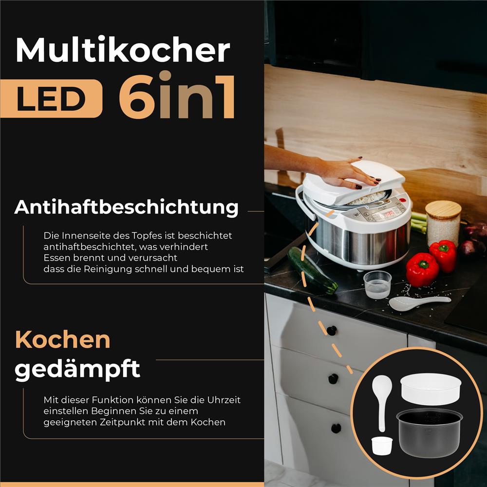 - 6 Funktionen: 1. weißer Reis, 2. brauner Reis, 3. langsames Kochen, 4. Haferflocken, 5. Dämpfen, 6. Teig