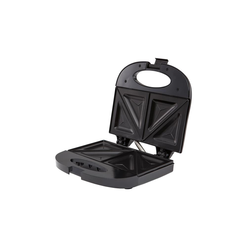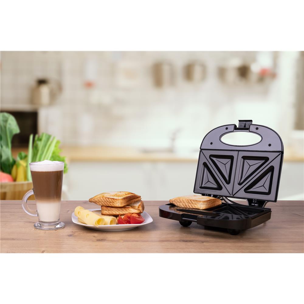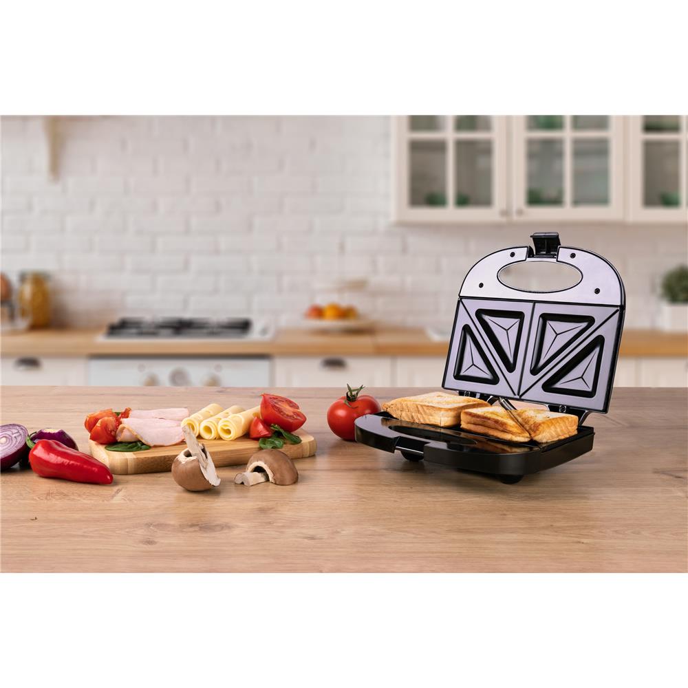 Ein praktischer Sandwichtoaster mit einer maximalen Leistung von 850 Watt. Ermöglicht die gleichzeitige Zubereitung von 2 Sandwiches, die in 4 dreieckige Stücke aufgeteilt werden. Die spezielle Beschichtung der Kochplatten verhindert das Anhaften und macht das Gerät leicht sauber zu halten. Der Thermostat signalisiert, wenn die Kochplatten ausreichend heiß sind und sorgt während des gesamten Toastvorgangs für die richtige Temperatur. So werden die zubereiteten Sandwiches knusprig und golden.