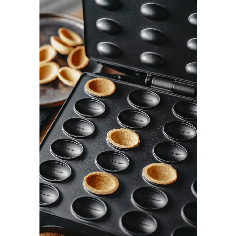 Ein Gerät zum Backen von Keksen in Form von mit Creme gefüllten Nüssen, je nach Vorliebe süß oder trocken. Die XL-Größe ermöglicht das Backen von bis zu 24 Nusshälften in einem Durchgang. Das Bakelit-Gehäuse, die thermoisolierten Griffe und die Antihaftbeschichtung der Heizplatte sorgen für eine komfortable Handhabung des Gerätes. Die hohe Leistung von bis zu 1600 W ermöglicht das Backen einer Partie Kekse in maximal 2 Minuten.