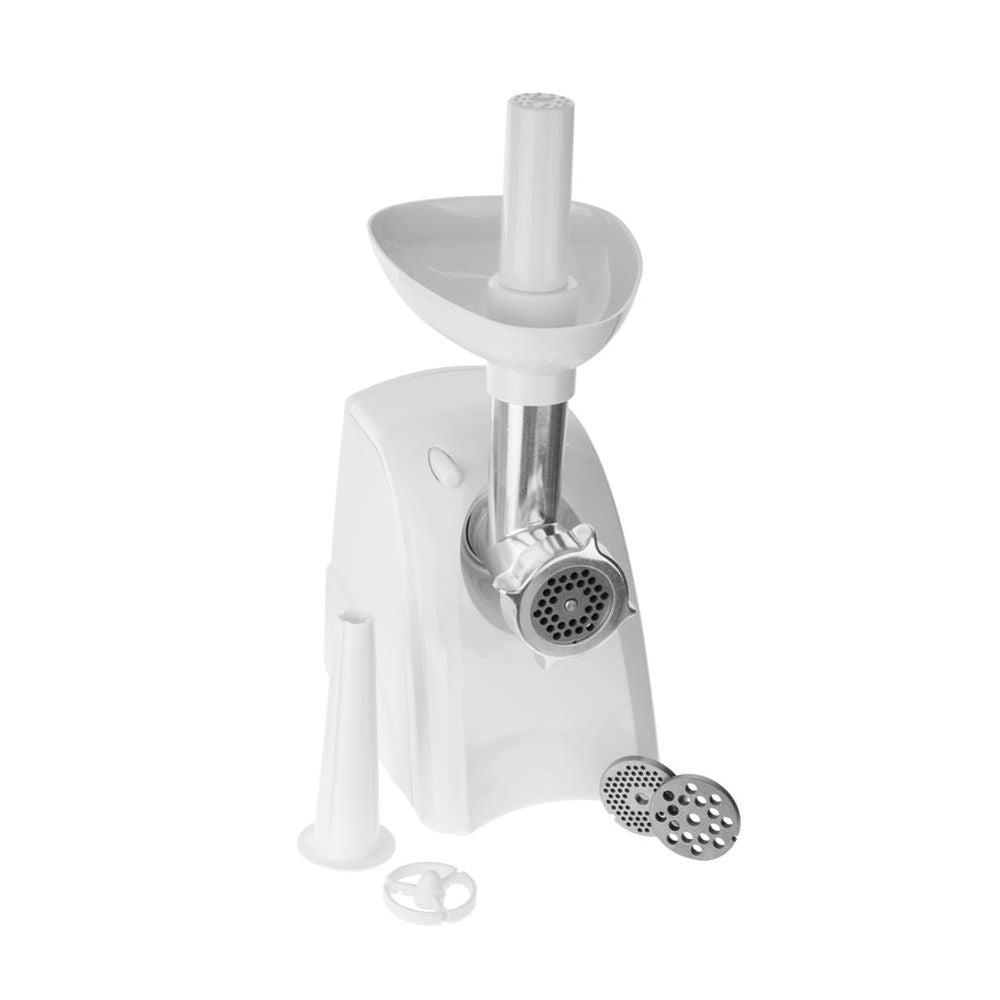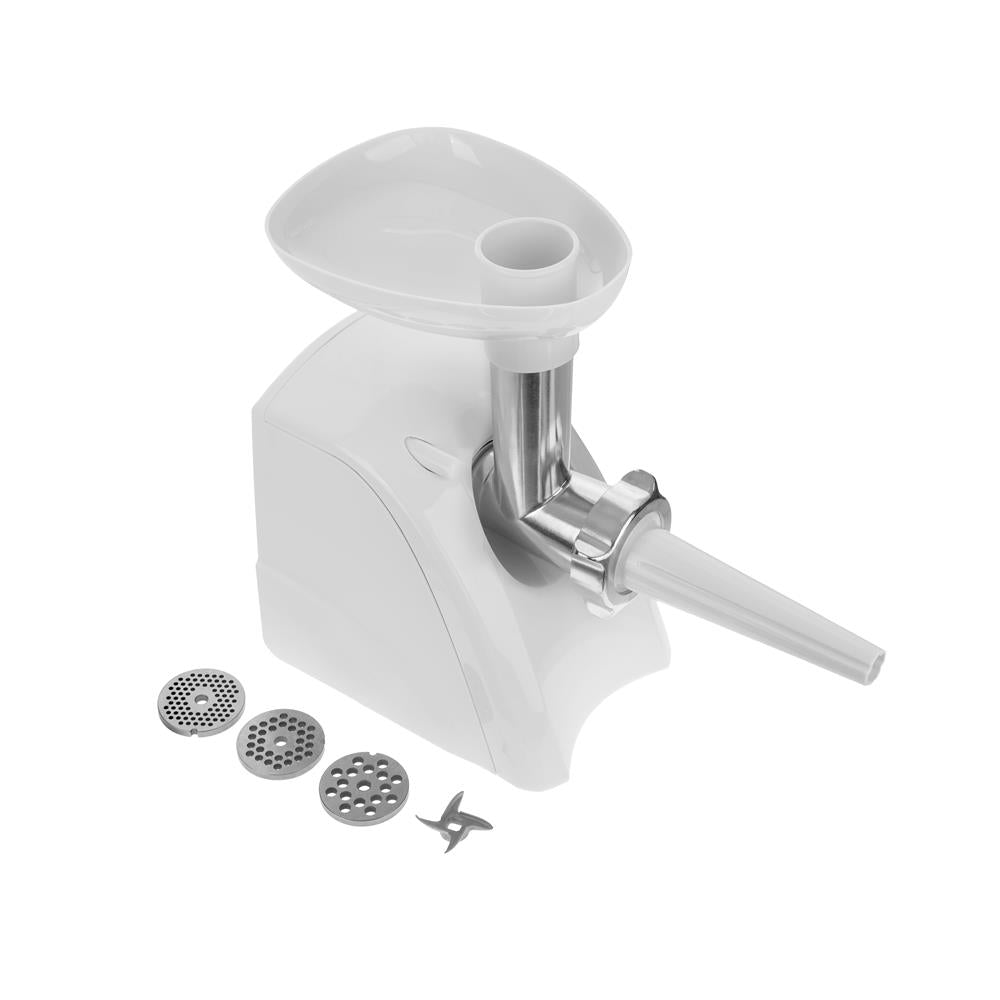 Es ist mit drei Schneidsieben (austauschbar) ausgestattet: eines für Hackfleisch, das zweite für Mohn, das dritte hat die mittelgroßen Löcher. Im Set enthalten sind auch ein Stampfer und ein Wurstfüller. Das ganze Gerät besteht aus haltbaren Materialien, die leicht zerlegt und gereinigt werden können. Der Fleischwolf hat eine Leistung von 800W (mit der maximalen Leistung von 2000W). Aufgrund dieser Tatsache bietet er die Möglichkeit, Lebensmittel ohne Anstrengung des Bedieners zu zerkleinern. Er hat auch eine "Puls" Funktion.