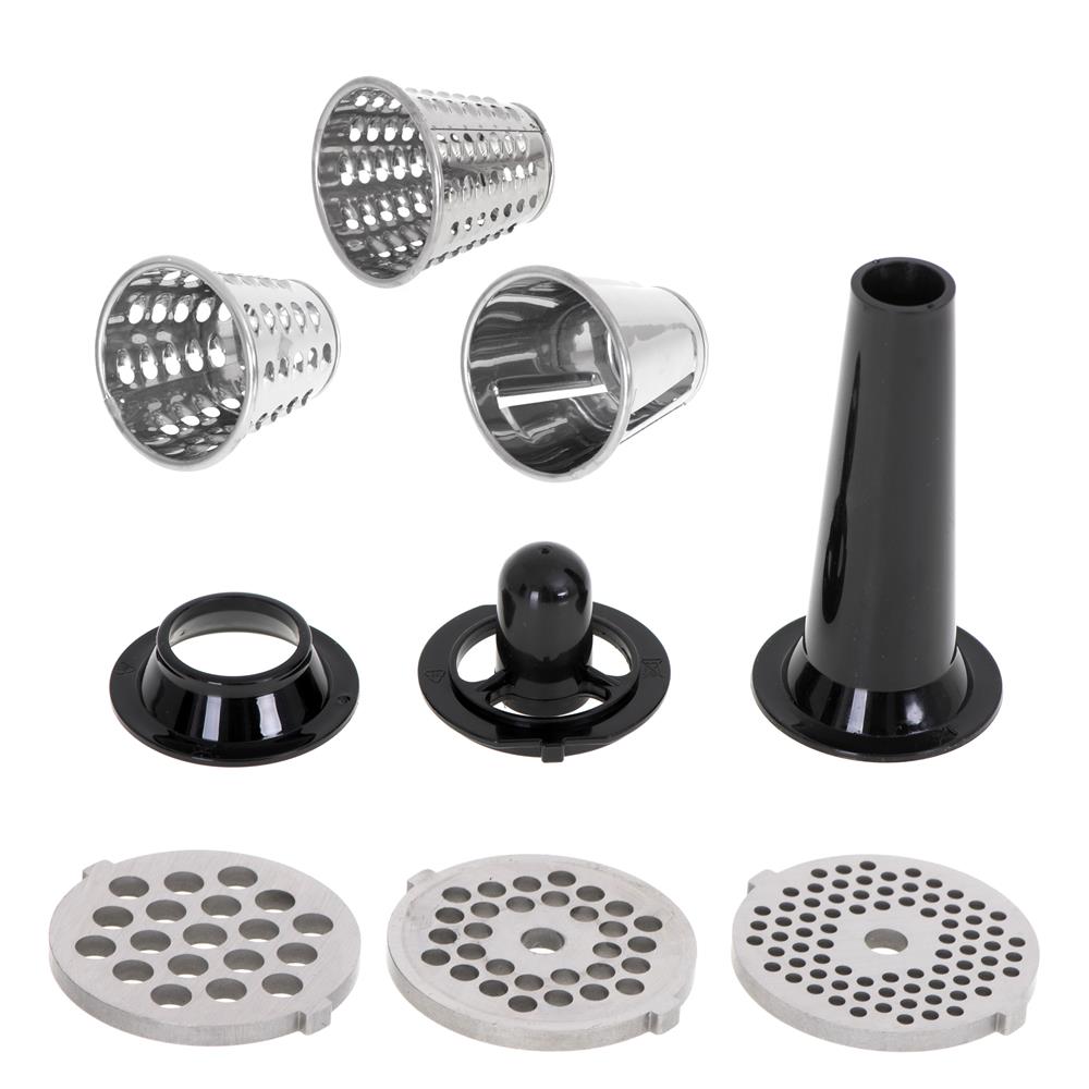 - Mahlkammer mit Schneckengetriebe, Kreuzmesser, Mutter, 3 Siebe mit 3,5,7 mm Löchern und Stößel