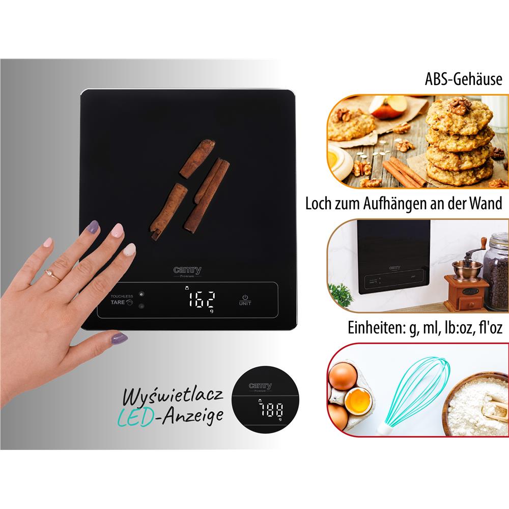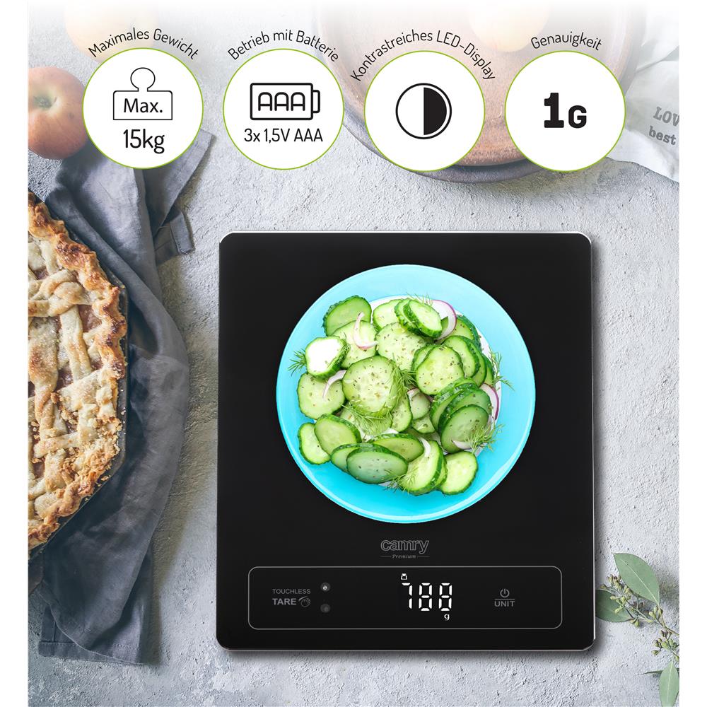 Camry CR 3175 digitale Küchenwaage mit 15 kg Kapazität, LED-Anzeige und Gestensteuerung, schwarz