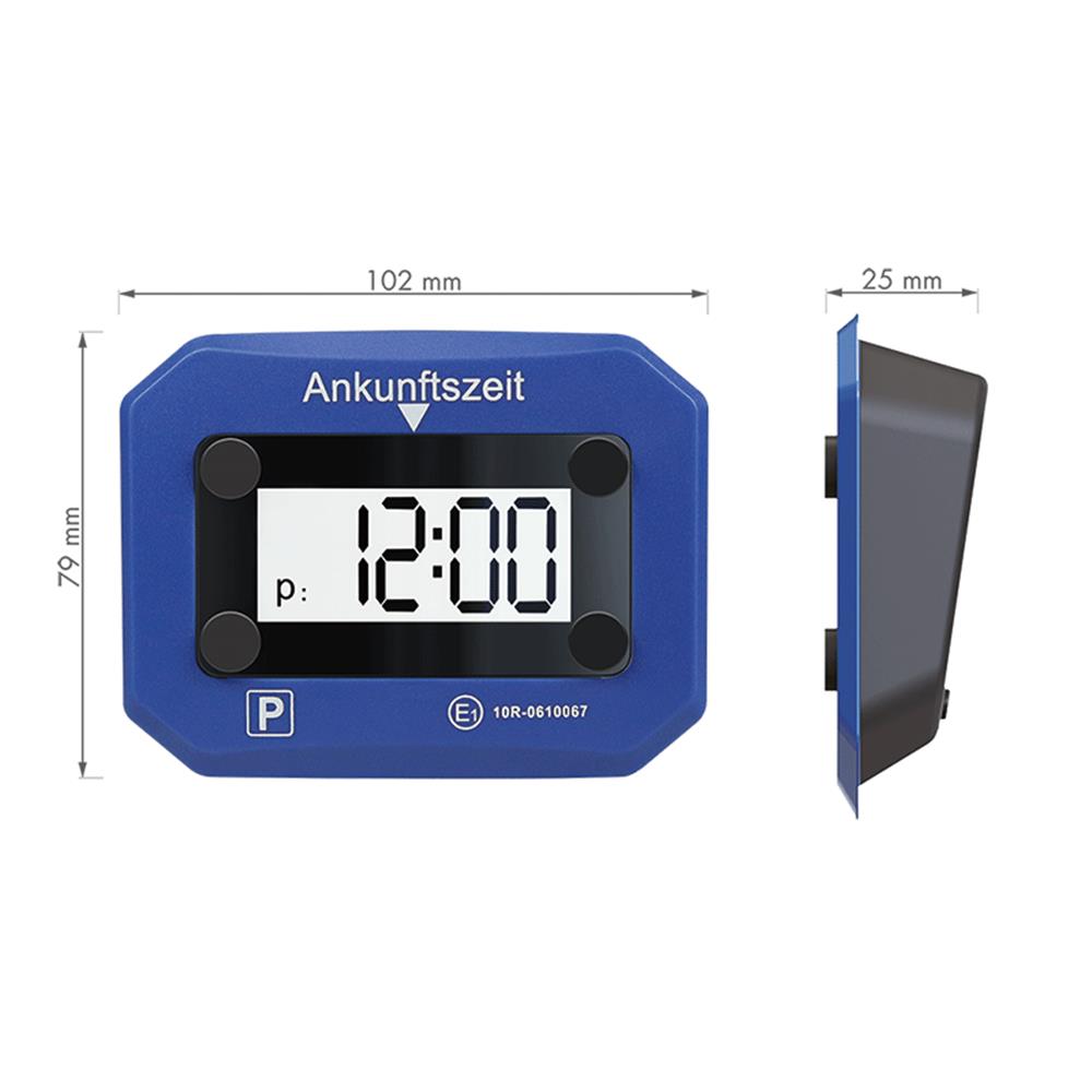 Vermeiden Sie Parkstrafen wegen fehlender oder falsch eingestellter Parkscheiben. Unsere digitale Parkuhr stellt sich automatisch nach 1 Minute Stillstand auf die aktuelle Ankunftszeit ein. Für den Fahrer gibt es ein zweites, klar ablesbares LCD-Display, auf dem die Uhrzeit, das Datum und der Batteriestatus angezeigt werden. Betrieben wird die Uhr mit einer CR2450 Knopfzellenbatterie.