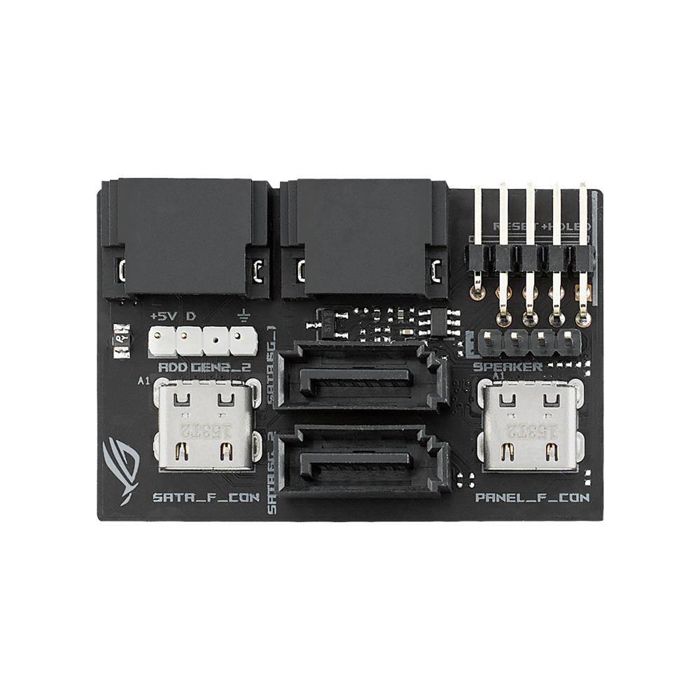 Das ROG Strix Z690-I Gaming WiFi wird mit einer Erweiterungskarte geliefert, die zusätzliche Funktionen wie vier SATA-Anschlüsse, einen ARGB-Beleuchtungsanschluss und Anschlüsse für einen Frontpanel-Header und einen PC-Lautsprecher bietet. Dank dieser effizienten Platznutzung können PC-Bauer einige der kompaktesten PC-Builds mit vollem Funktionsumfang bauen. Für noch kompaktere Builds kann der Power-Button auch über den 2-Pin Power BTN onboard angeschlossen werden.