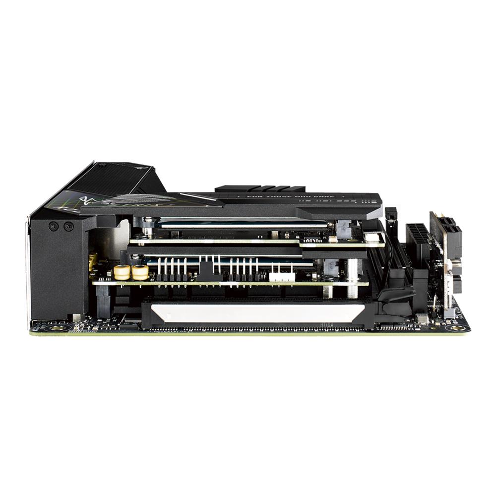 - Optimiertes Kühl-Design: Integrierte E/A-Abdeckung und VRM-Kühlkörper mit Wärmeleitpad, L-förmige Heatpipe, zwei Onboard-M.2-Kühlkörper und Backplates