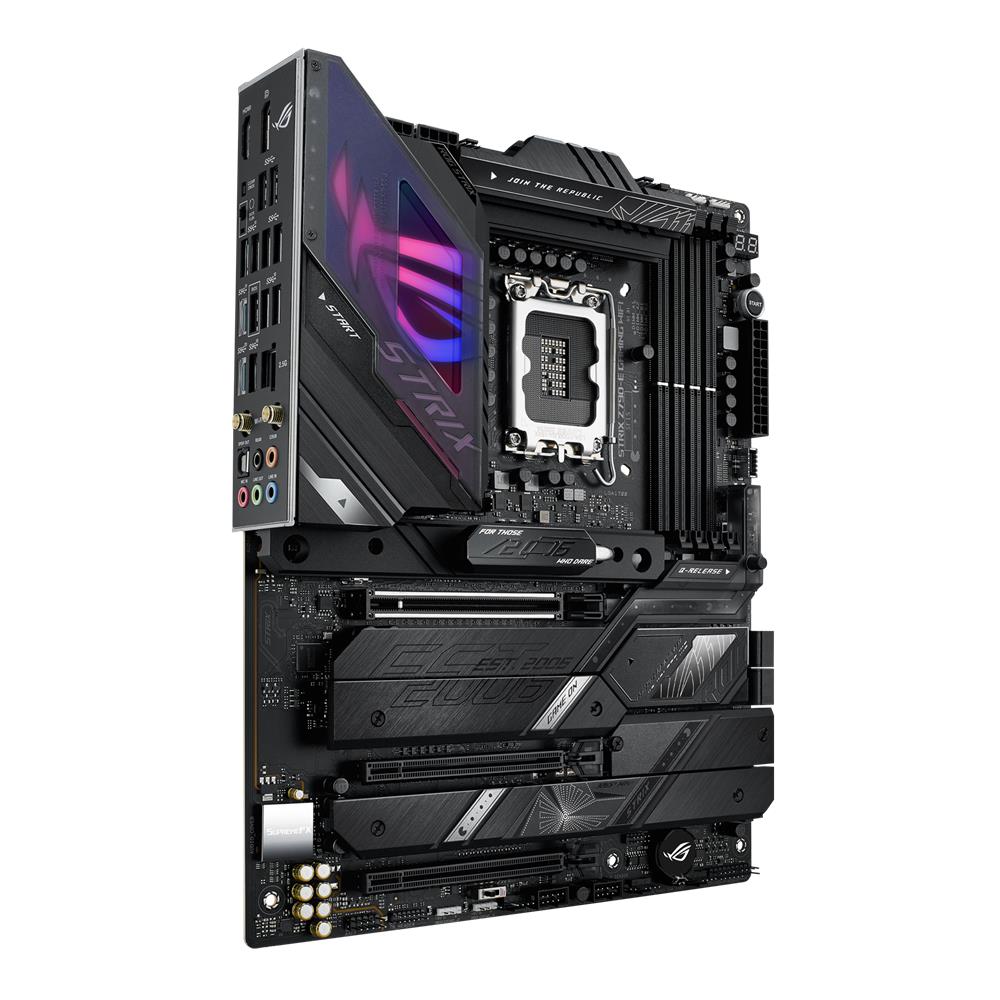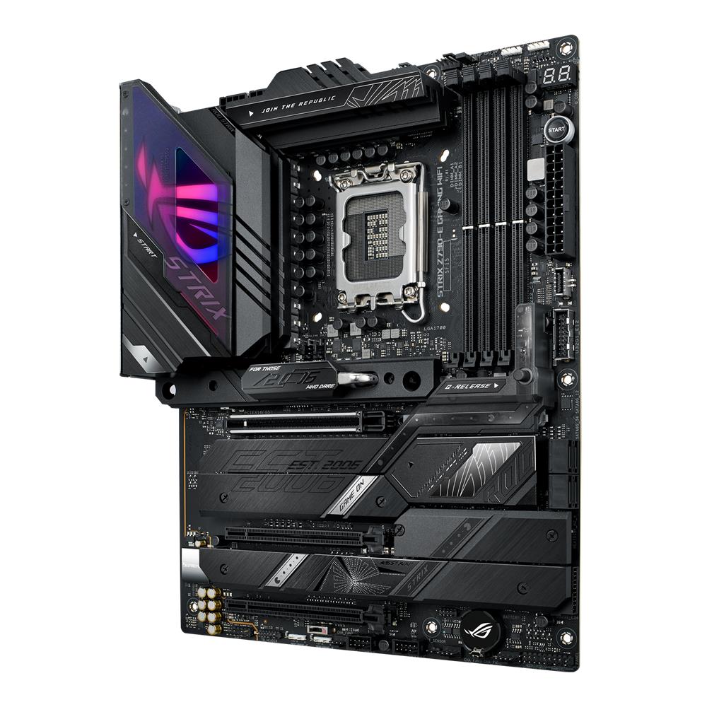 Mit dem Strix Z790-E durchbrichst du die 6-GHz-Grenze mit Stil. Transluzente Abdeckungen umranden das RGB-Ignition-Panel und spielen auf die Fähigkeit an, mit Hilfe von AI Overclocking und einem hyperreaktiven VRM auf Lichtgeschwindigkeit zu gehen. DDR5-Verbesserungen und eine Auswahl an PCIe 5.0-Optionen erhöhen die Geschwindigkeit noch weiter, und die Einrichtung ist dank der einzigartigen Q-Design-Funktionen ein Kinderspiel.