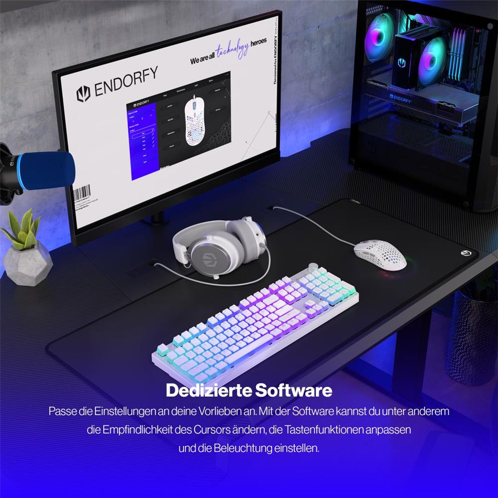 Mit der LIX Plus Onyx White kannst du das ENDORFY-Logo, das Scrollrad und sogar den Streifen rund um die Rückseite des Gehäuses hinterleuchten. Wähle deine eigene Farbe oder benutze einen der vordefinierten Effekte – du kannst die Konfiguration auch schnell mit der speziellen Software ändern.