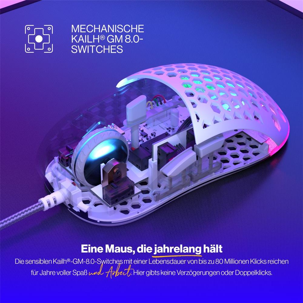 Sie wiegt nur 59 Gramm, doch ihr Herz besteht aus solidem Gold in Form des bewährten PixArt PAW3370 Sensors. Um das Paket zu vervollständigen, haben wir sie mit besonders langlebigen Kailh GM 8.0 Mikroschaltern ausgestattet. Diese Schönheit kann wirklich zuschlagen!