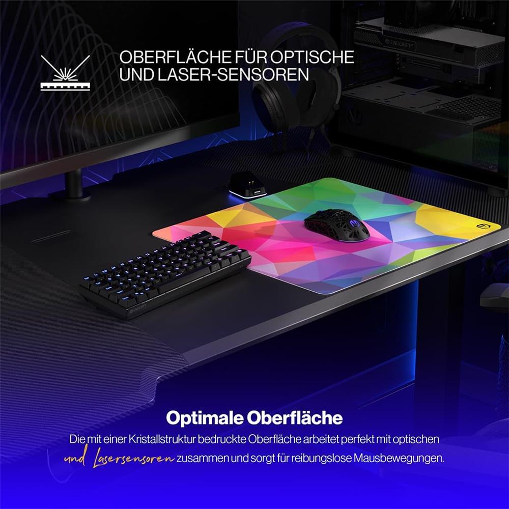 Die Oberfläche des Mauspads arbeitet perfekt mit optischen und Lasersensoren zusammen und sorgt für reibungslose Mausbewegungen. Der Aufdruck spielt auf die Struktur des Kristalls an, ist ein echter Hingucker und passt zu vielen Setups.