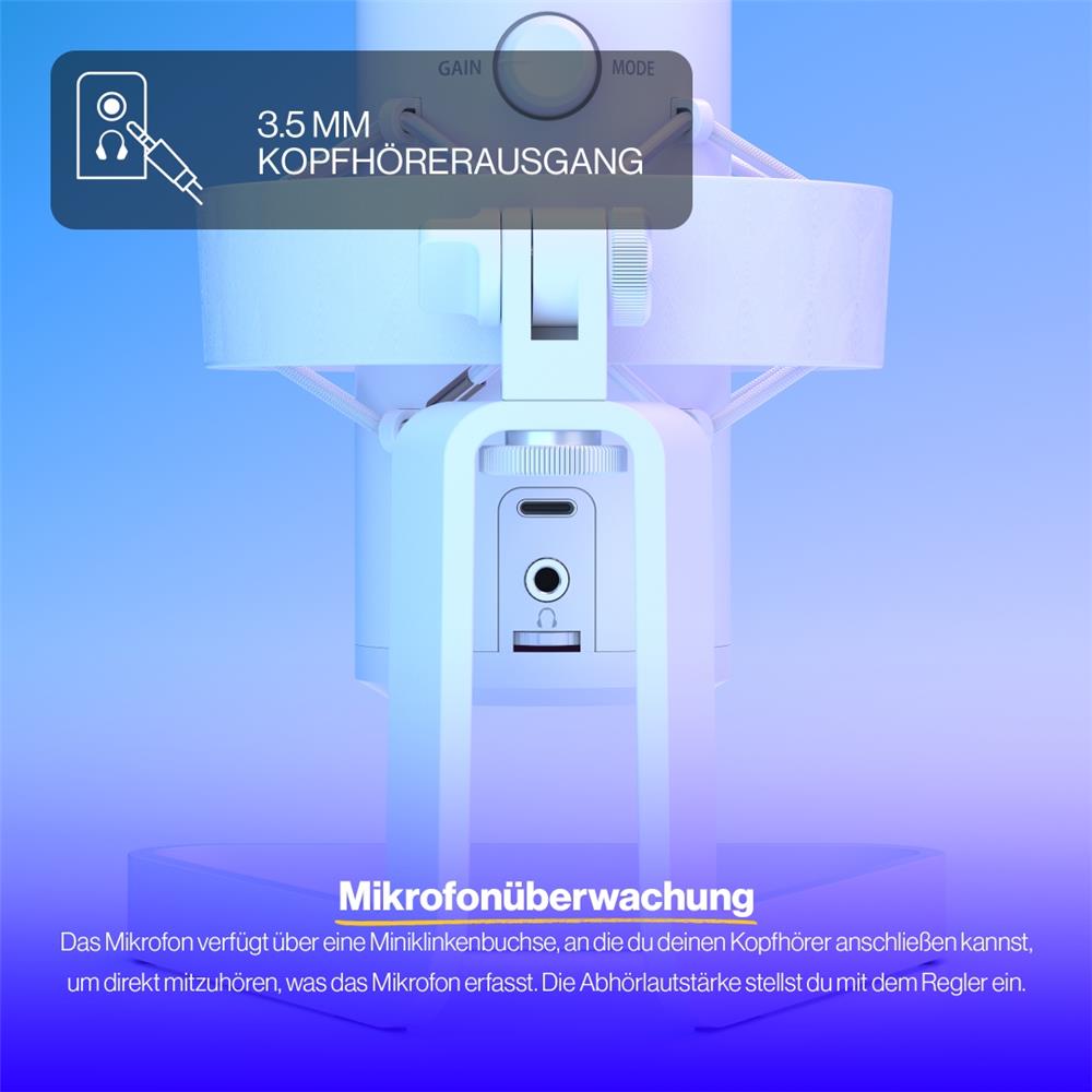 Mit dem AXIS Streaming Onyx White Mikrofon kannst du die Qualität deiner Aufnahmen in Echtzeit einfach steuern. Dies ist eine bequeme Option beim Podcasten oder Streaming und lässt dich in jeder Situation wie ein Profi klingen. Stecke einfach deine Kopfhörer in das Mikrofon und werde zum Sound-Engineer.
