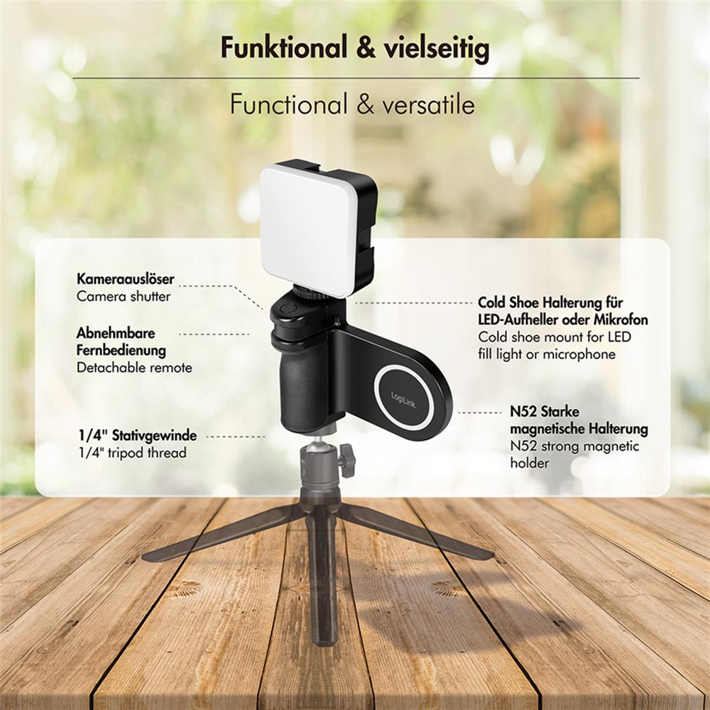 LogiLink Magnetischer Smartphone-Griff mit LED-Licht & BT5.2 Kameraauslöser – MagSafe-kompatibel