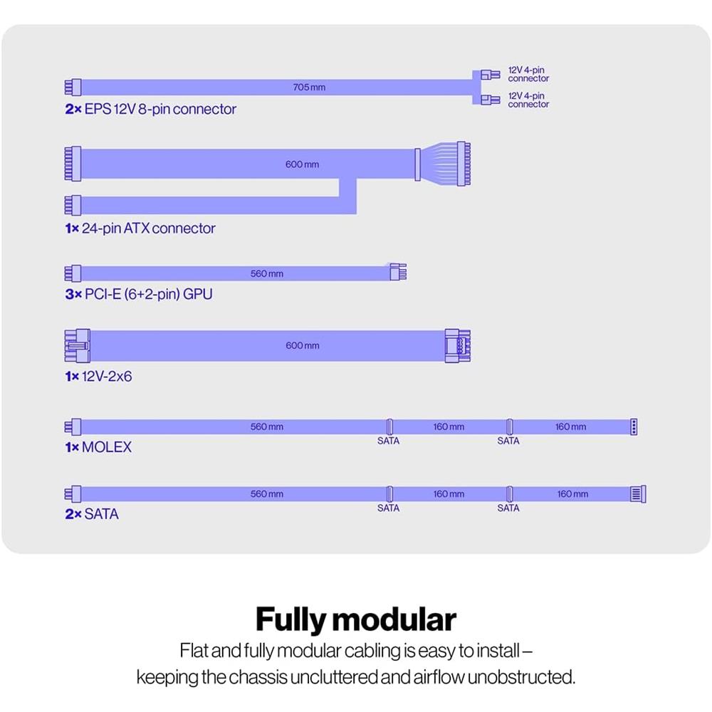 Mit ATX 3.1-Kompatibilität und einem 12V-2x6-Kabel unterstützt das Netzteil auch die neuesten PCIe 5.1-Grafikkarten. Für maximale Flexibilität sind zudem klassische PCIe-6+2-Pin-Kabel im Lieferumfang enthalten.