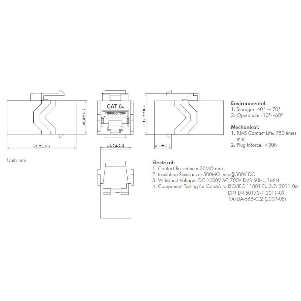 • Unterstützt Cat.6A Klasse EA Channel für 10 Gigabit Ethernet gemäß ISO/IEC 11801 und TIA/EIA 568 Standards