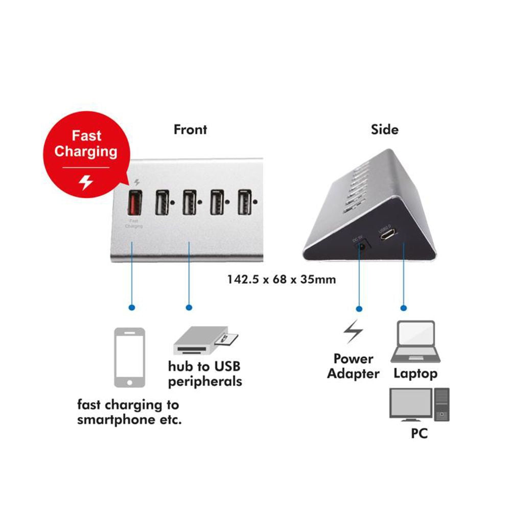Der schnelle Hub unterstützt den modernen USB 2.0-Standard mit bis zu 480 MBit/s und erweitert Ihnen den Anschluss auf bis zu 7 Ports + 1x Schnell-Ladeport. Sie können aber natürlich auch alle Geräte älterer USB Generationen anschließen. Dieser praktische und edel aussehende Hub zieht alle Blicke auf sich und ist dabei sehr leistungsstark.