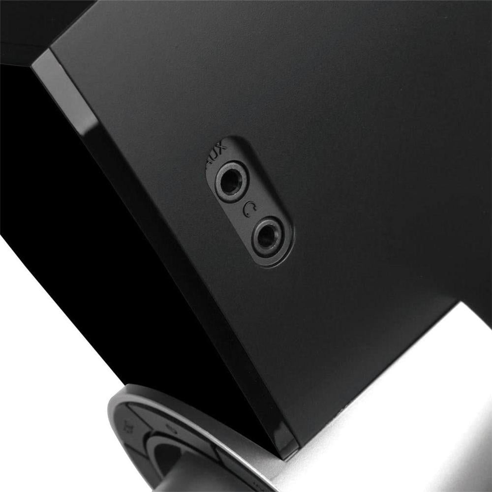 Dank des externen Verstärkers lassen sich Subwoofer und Steuerung flexibel platzieren. Neben einem Kopfhörerausgang bietet er einen AUX-Eingang für zusätzliche Geräte. Das System unterstützt PC-, AUX- und optische Eingänge und speichert individuelle Einstellungen wie Lautstärke, Bass und Höhen.
