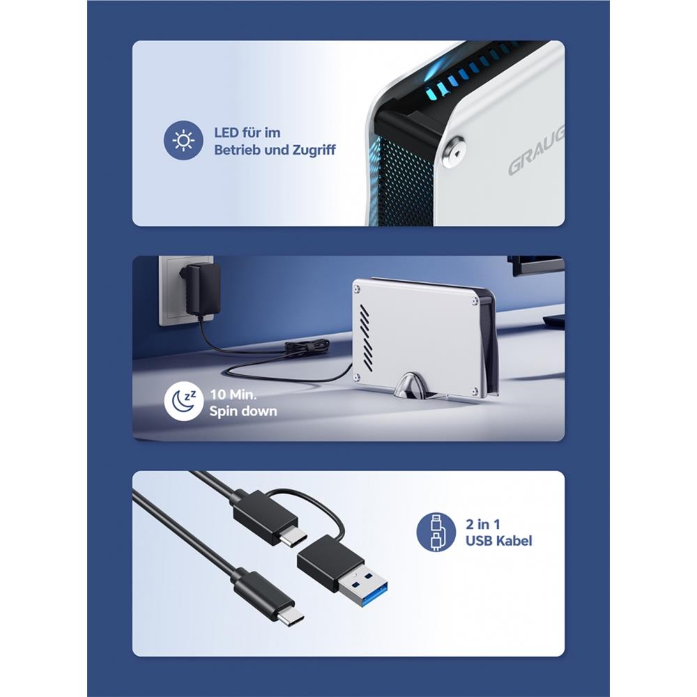 Die GRAUGEAR Satellite G-3505-Festplatte ist eine optisch ansprechende Gamingbibliothek. Mit der blitzschnellen USB 3.2 Gen1 Verbindung können Deine Gaminginhalte super schnell geladen werden und stehen Dir so für ein ungetrübtes Gamingerlebnis zur Verfügung. Diese externe Festplatte wurde für den Betrieb an einer PlayStation 5/PS4 formatiert.