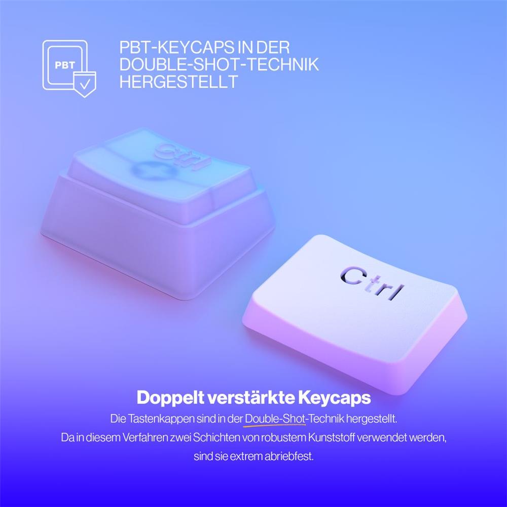 Vielen Dank dafür an unsere Double-Shot Keycaps! In dem Herstellungsprozess werden zwei Arten des durch eine hohe Festigkeit auszeichneten PBT-Kunststoffs zusammengefügt. Deine Tasten werden lange Zeit die Farbe und Zeichen behalten. Die milchig-weißen Teile (deswegen steht Pudding im Namen) lassen zudem die ARGB-Beleuchtung durch.