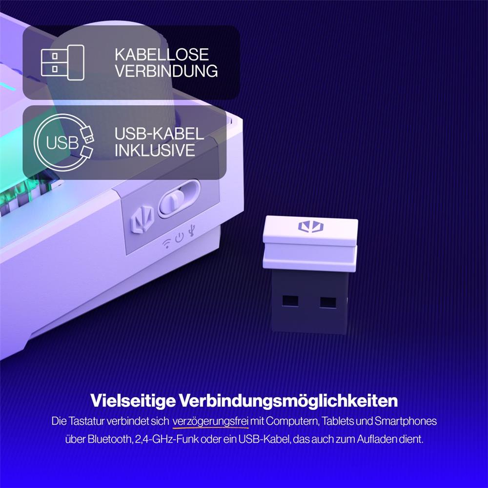 Die Tastatur lässt sich ohne Verzögerung über Bluetooth oder 2.4 GHz mit deinem Computer, Tablet oder Smartphone verbinden. Im Lieferumfang ist auch ein USB-Kabel enthalten, mit dem du die Tastatur kinderleicht an deinem Computer anschließen kannst.