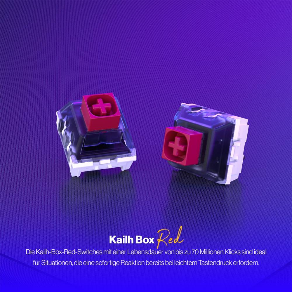 Kailh Box Red sind Linear Switches. Sie meistern es vorbildlich, wenn du sofort reagieren musst. Im Vergleich zu den Kailh Red Switches hat die Box-Version einen verstärkten Schaft, der die Tasten stabilisiert und vor Staub schützt.