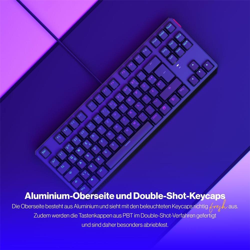 Die Oberseite besteht aus Aluminium und sieht mit den beleuchteten Keycaps richtig fresh aus. Zudem werden die Tastenkappen aus PBT im Double-Shot-Verfahren gefertigt und sind daher besonders abriebfest.