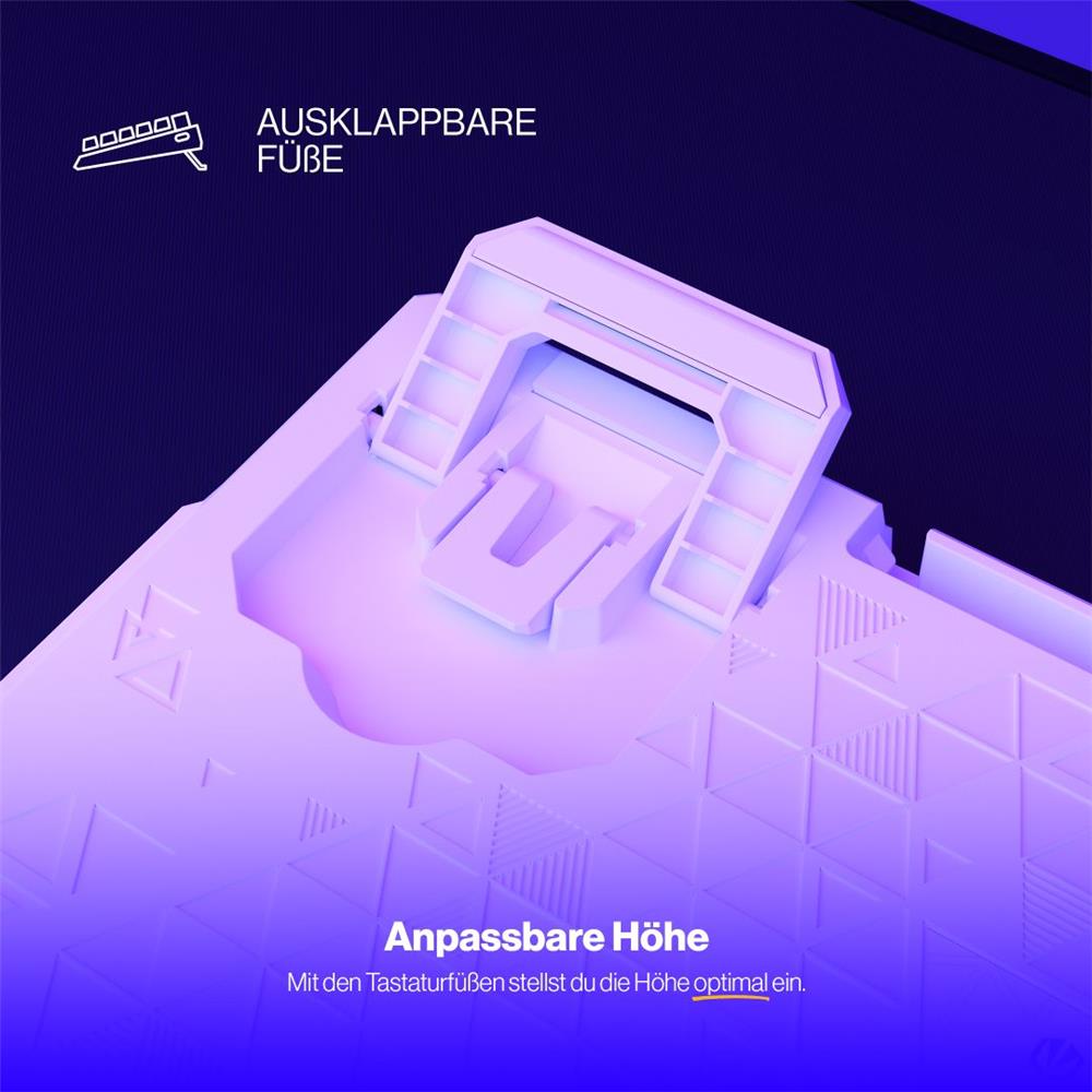 Die Thock 75% Wireless DE Kailh Box Black Onyx White Pudding haben wir für deinen Komfort mit verstellbaren Füßen ausgestattet. Dank der verstellbaren Höhe kannst du sie in eine bequeme Schreibposition bringen. Das ist noch nicht alles! Du kannst sie noch zusätzlich mit einer magnetischen Handballenauflage kombinieren (separat erhältlich), um deine Handgelenke in entspannter Position aufzulegen und mehr Vergnügen am PC zu haben.