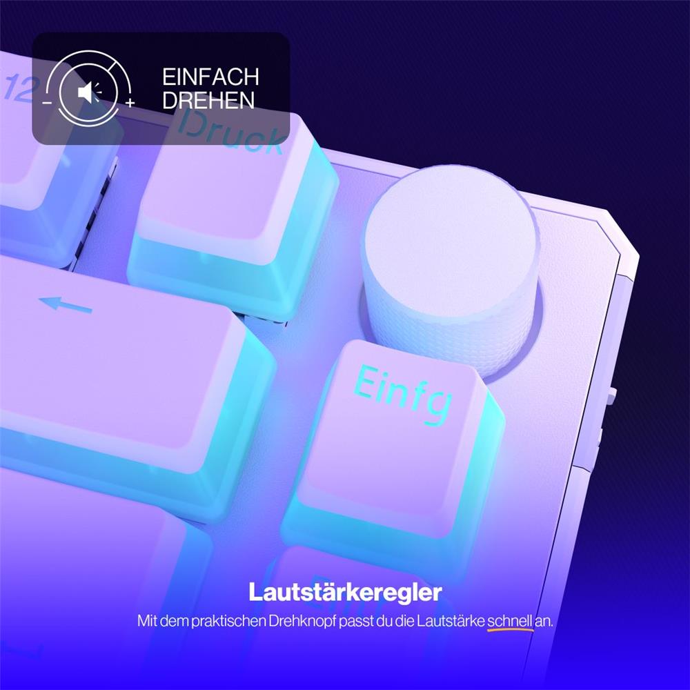 Das ist dank des Lautstärkereglers aus Metall möglich, den wir der Tastatur hinzugefügt haben. Er hat akzentuiertes und haptisches Feedback, sodass du die Lautstärke in den kleinsten Stufen einstellen kannst, ohne den Blick vom Monitor abzuwenden. Die Lautstärke wird durch Drehen des Steuerungsknopfs eingestellt und das Stummschalten ist mit nur einem Klick möglich.