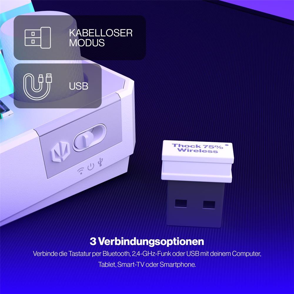 Die Thock 75% Wireless DE Kailh Box Black Onyx White Pudding wird deine gute Freundin, wenn du flexible Lösungen gerne hast. Du kannst sie auf 3 verschiedene Arten mit anderen Geräten verbinden, also kannst du sie überall verwenden, nicht nur auf deinem Schreibtisch.