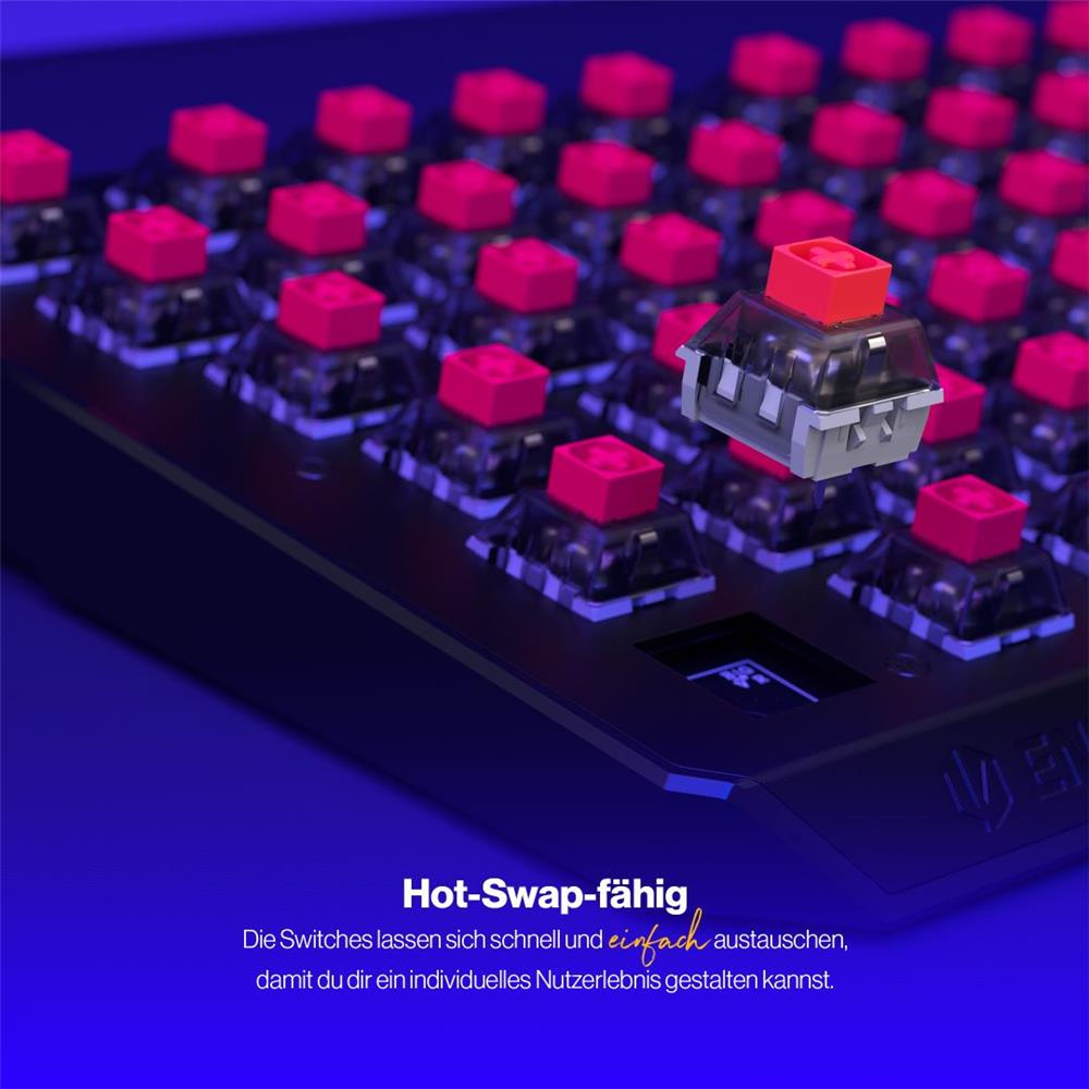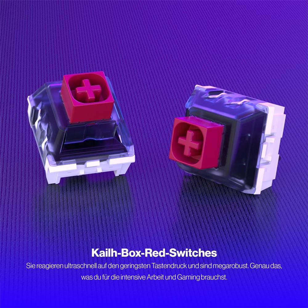 Unter jeder Taste findest du robuste Kailh Box Red Switches. Das sind rote Switches, die sogar bis zu 70 Mio. Tastenanschläge überleben. Sie arbeiten mit den PBT Double-Shot Keycaps zusammen, die so stark wie voll ausgerüstete Ritter sind. Unsere Kämpferin haben wir zudem mit der Hot-Swap Funktion ausgestattet und sie ist mit vielen 3 und 5 Pin-Switches kompatibel – also kannst du deine Switches jederzeit austauschen.