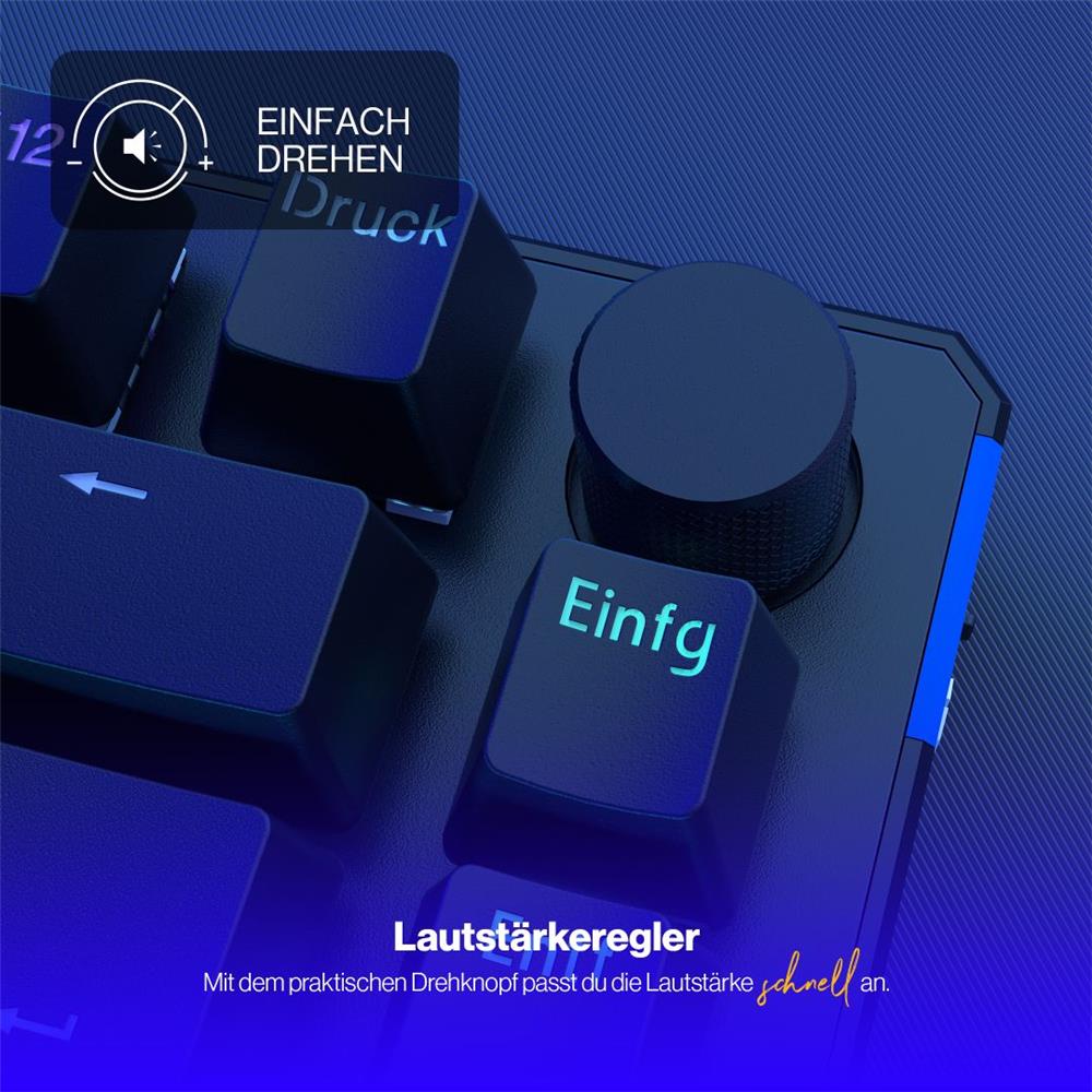Das ist dank des Lautstärkereglers aus Metall möglich, den wir der Tastatur hinzugefügt haben. Er hat akzentuiertes und haptisches Feedback, sodass du die Lautstärke in den kleinsten Stufen einstellen kannst, ohne den Blick vom Monitor abzuwenden. Die Lautstärke wird durch Drehen des Steuerungsknopfs eingestellt und das Stummschalten ist mit nur einem Klick möglich.